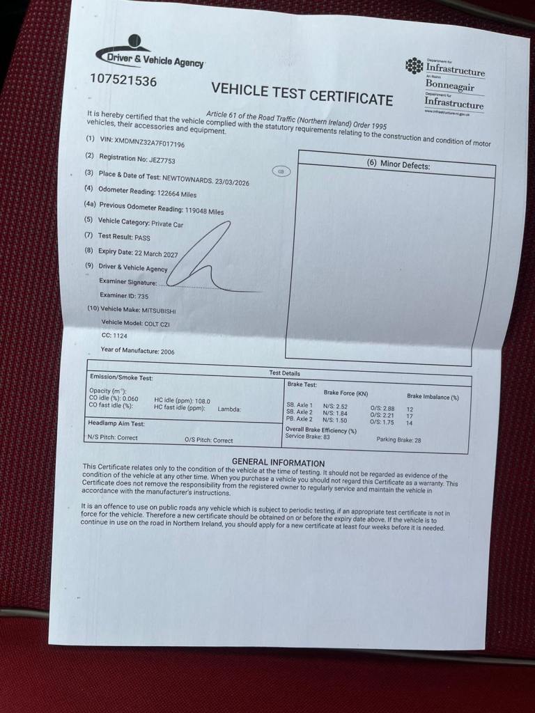 Car passed MOT on the 23/3/26. Full years ticket with no advisory’s