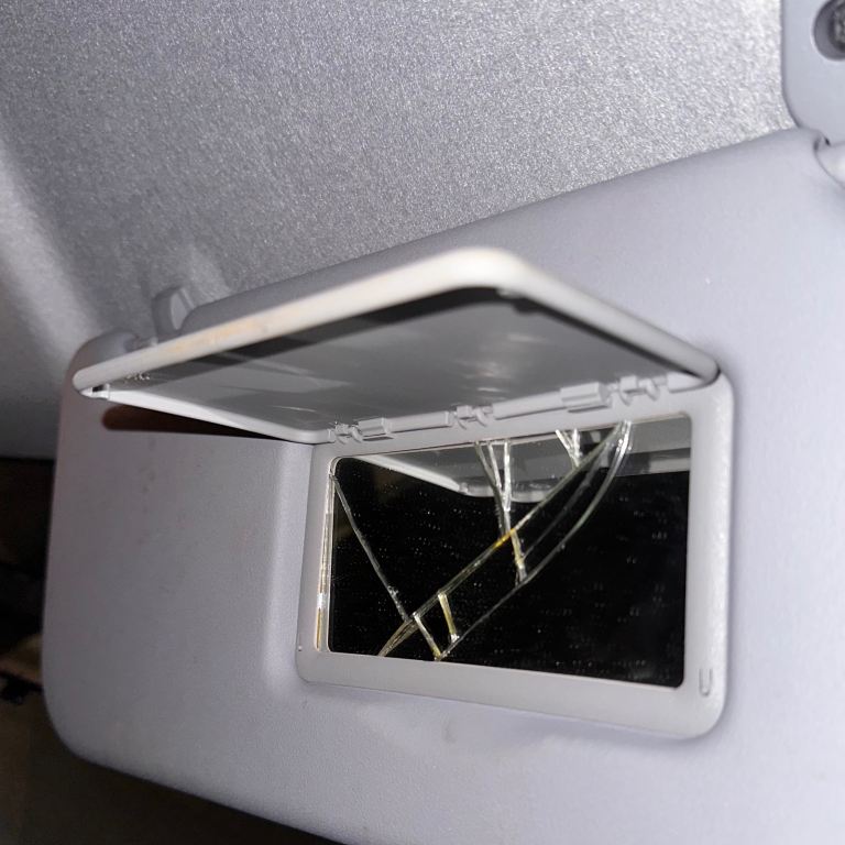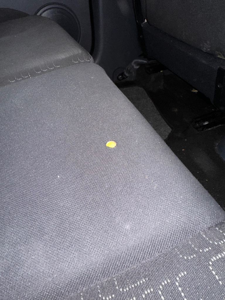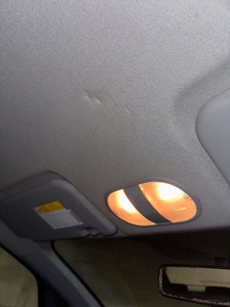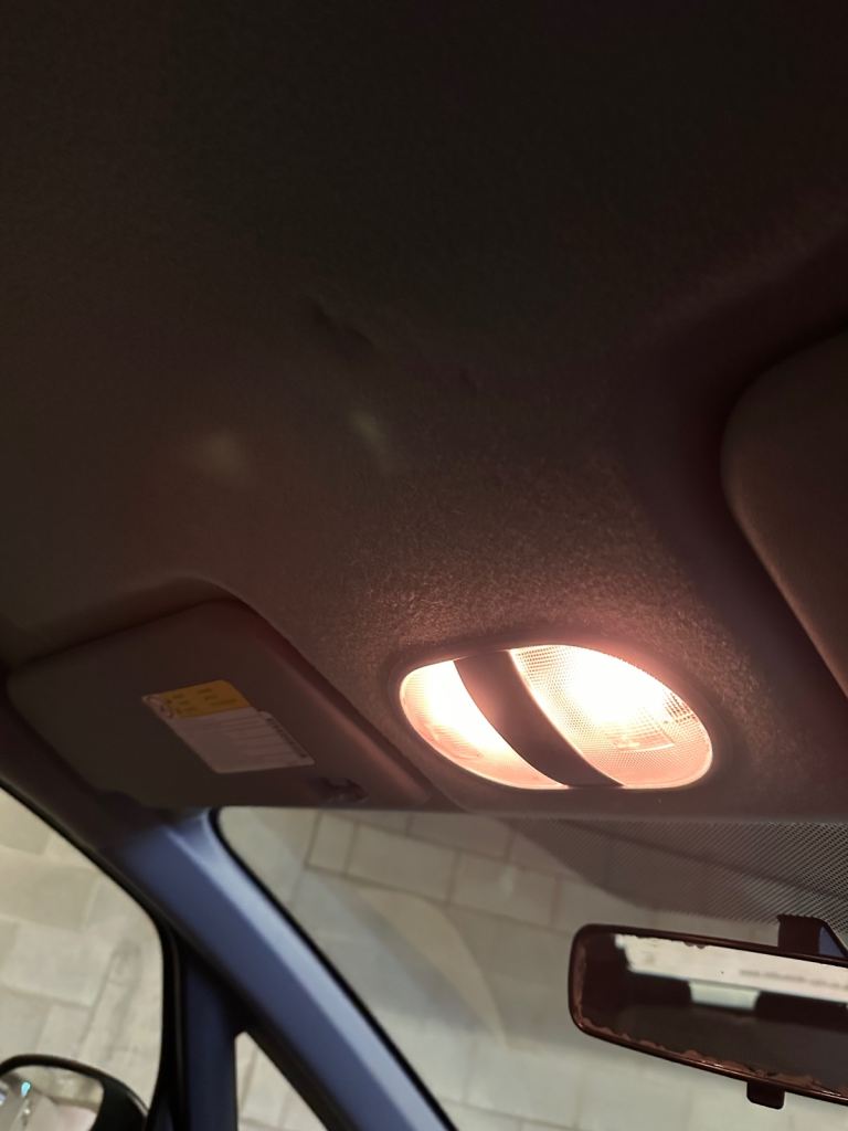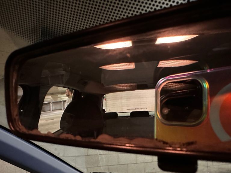 • Interior Flaws: The cabin is generally tidy, but there is a small cigarette burn on the rear seat and a minor mark on the headliner. The passenger sun visor mirror is cracked, and the plastic button on the end of the handbrake is missing (the handbrake mechanism itself still works perfectly).