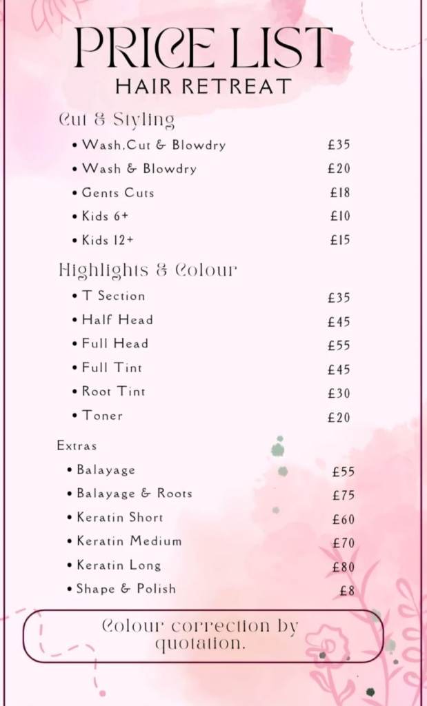 The retreat benefits from having a quiet, tranquil atmosphere. Aswell as 1:1 hair care. This is the perfect setting for anyone that finds busy salons over welming.
