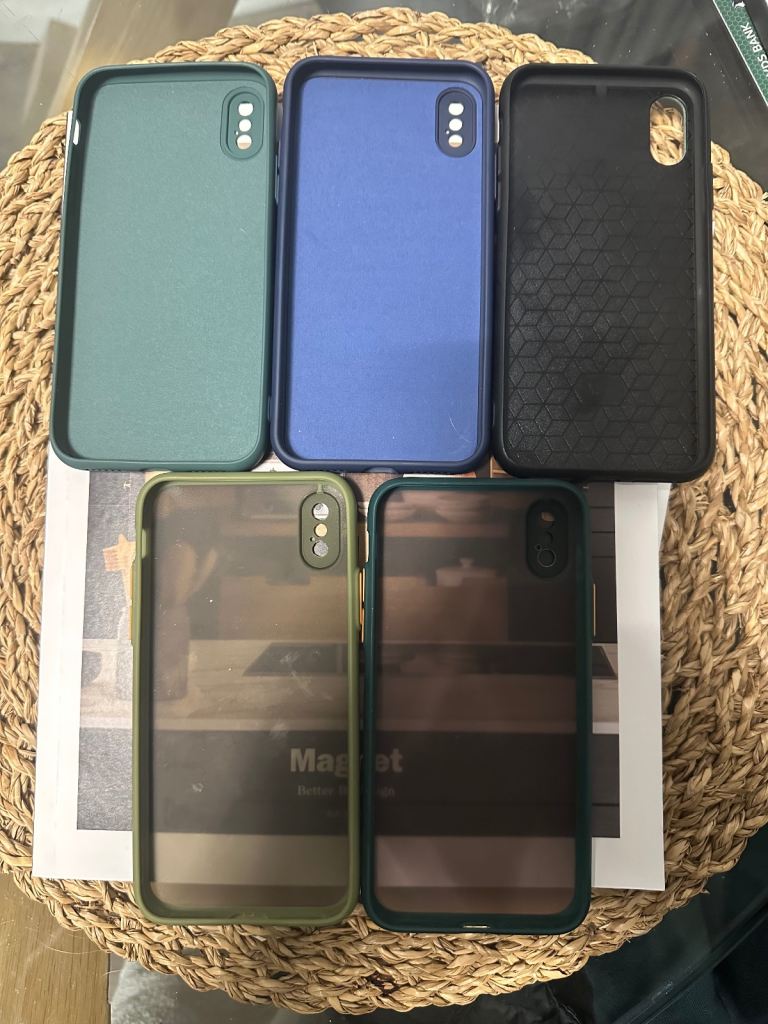 5 brand new iPhone XS cases and 2 new screen protectors for the same phone. They have never been used as my phone broke right after buying the cases.