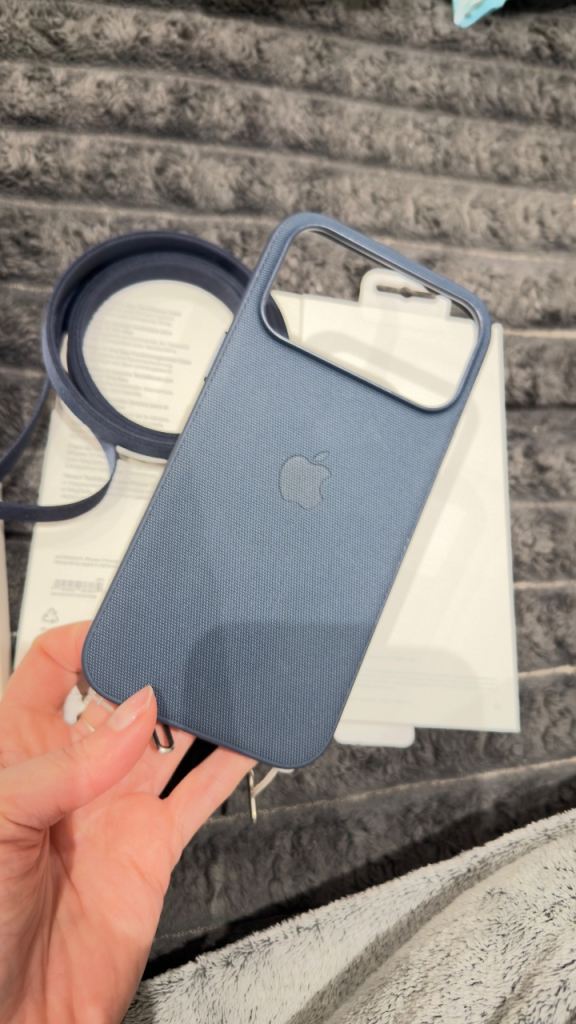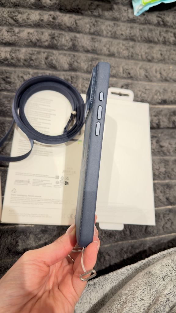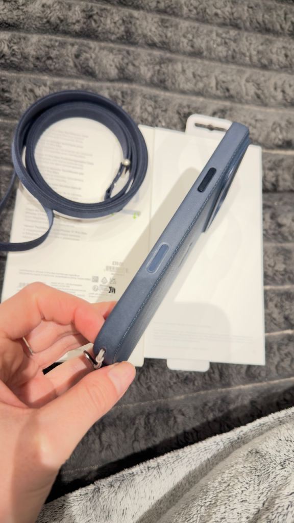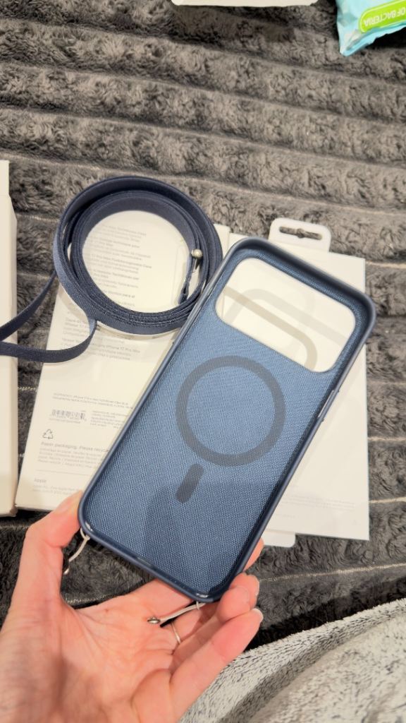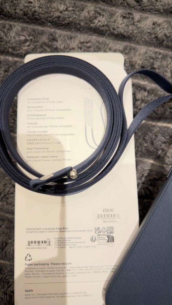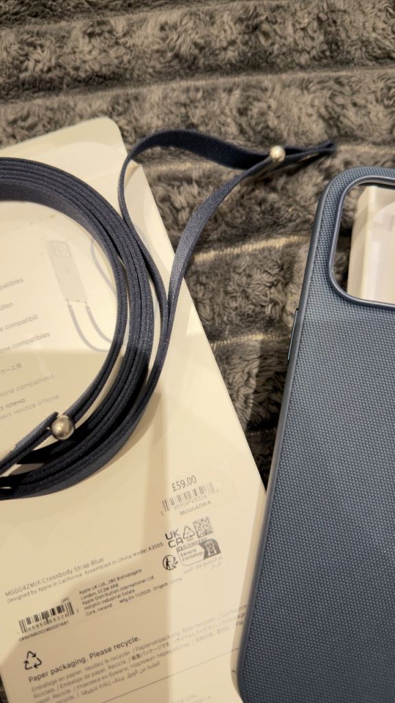 An original Apple phone case with a shoulder strap.