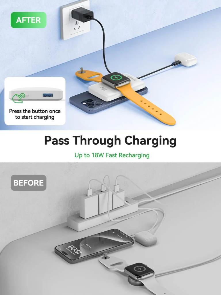 Magnetic Power Bank for Seamless Charging:Designed for wireless charging iPhone and Apple Watch simultaneously.Fits for iPhone 16/15/14/13/12 series, and all Apple Watch Series 1-10/SE/Ultra 2. Simply attach your devices to the magnetic charger and enjoy fast, cable-free charging.