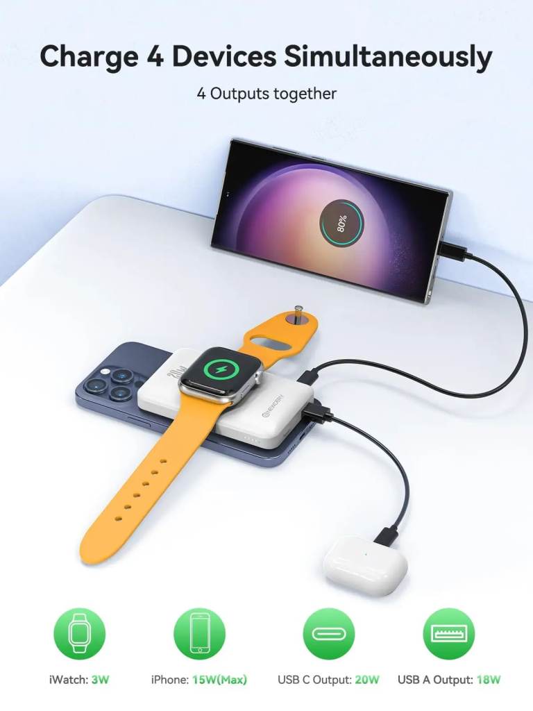 4 Devices Charging Simultaneously: Includes USB-C and USB-A ports, allowing you to charge up to 4 devices at once. It supports maximum wireless fast charging of 15W, with a maximum of PD 20W for USB-A and USB-C.