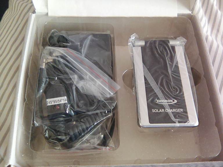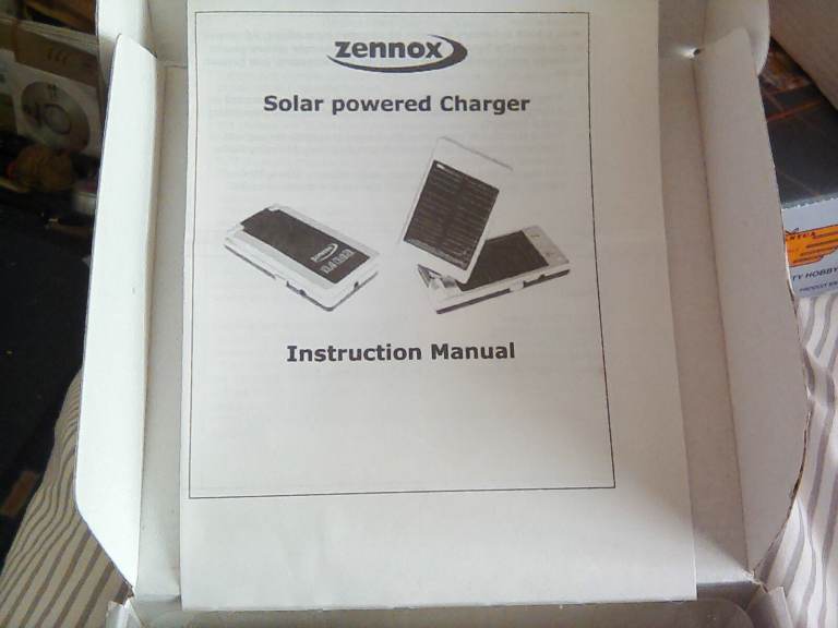 Zennox Solar powered mobile phone charger,all information on box front and sides, Also instructions booklet,