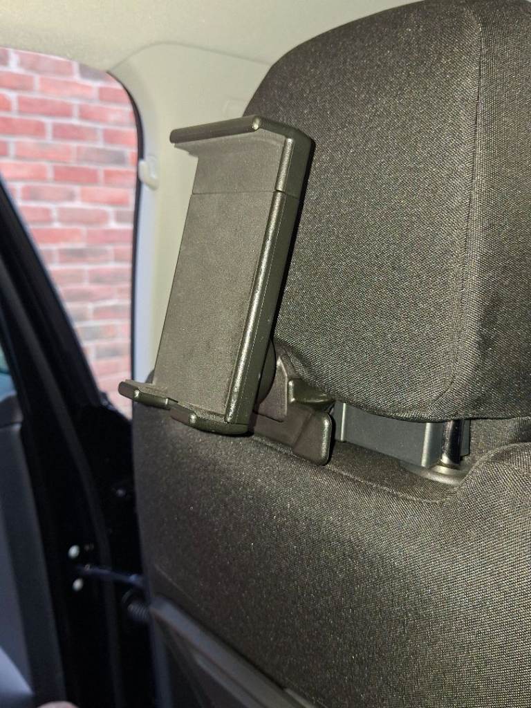 Holder and bracket that fit into front seat headrests of most recent Skoda cars, but not those with sports seats.