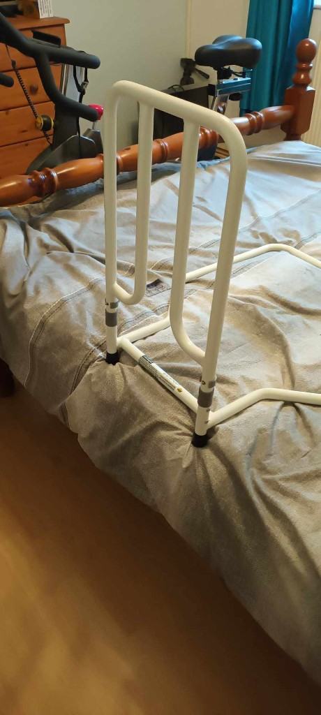 Provides help getting in and out of bed. Height adjustable legs and grip bar