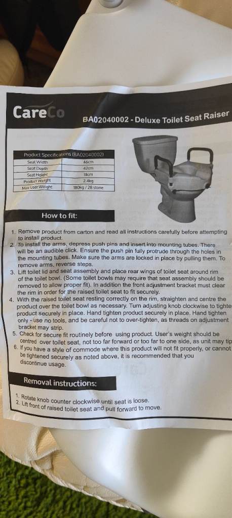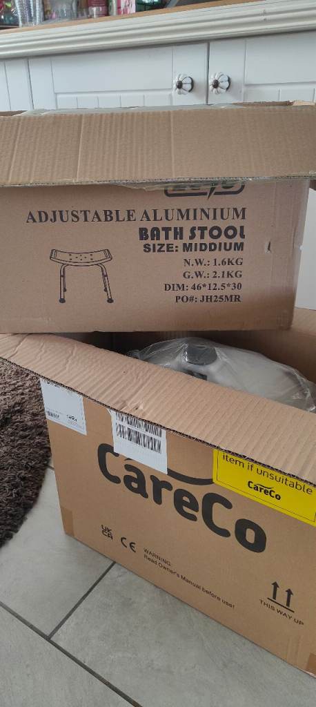 Deluxe Toilet Seat Raiser with arms, and an Adjustable Aluminium Bath Stool. Bought new from Care co. In excellent clean condition, original packaging. Both items proved invaluable to aid my recovery from recent hip surgery. Perfect for anyone needing extra support and assistance in bathroom. Also have a single bed size slide sheet. When folded, I also used to get in and out of car.