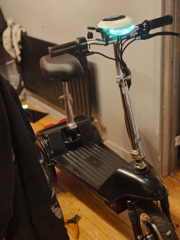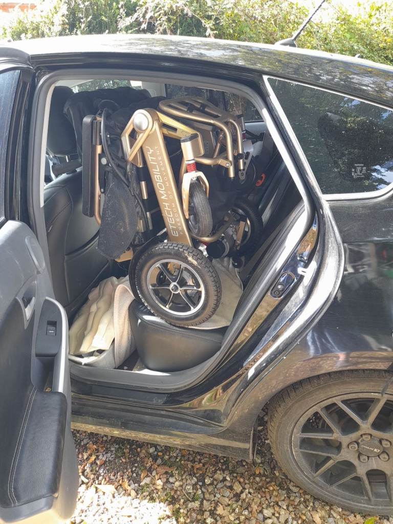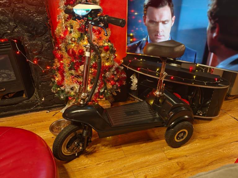 A low cost, pavement legal, mobility scooter with folding handlebars and seat so can be taken with you in the boot of a car. Features include front light, rear brake light, easy twist throttle, key, horn, front suspension and disc brake.