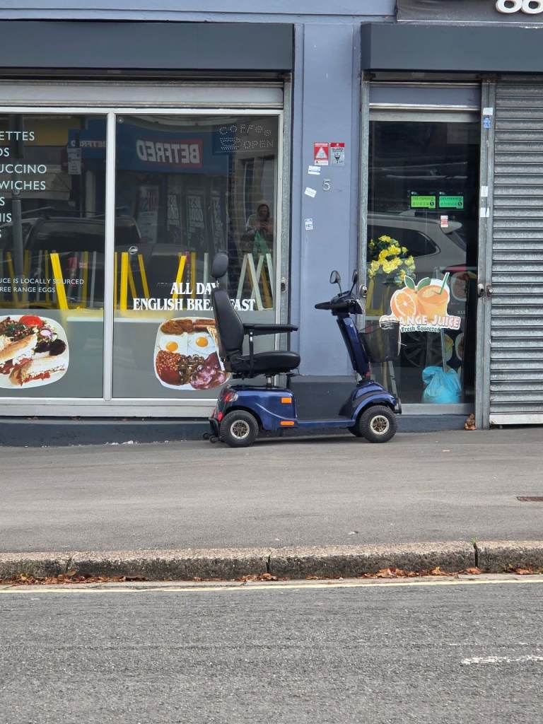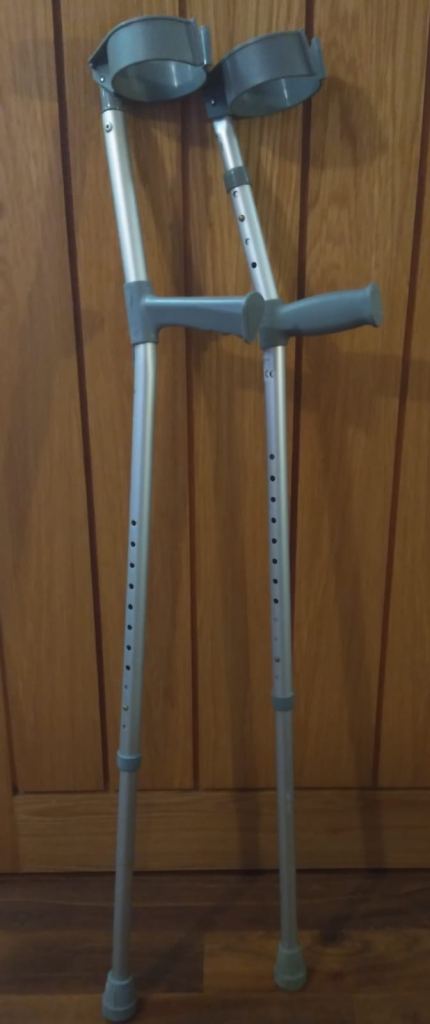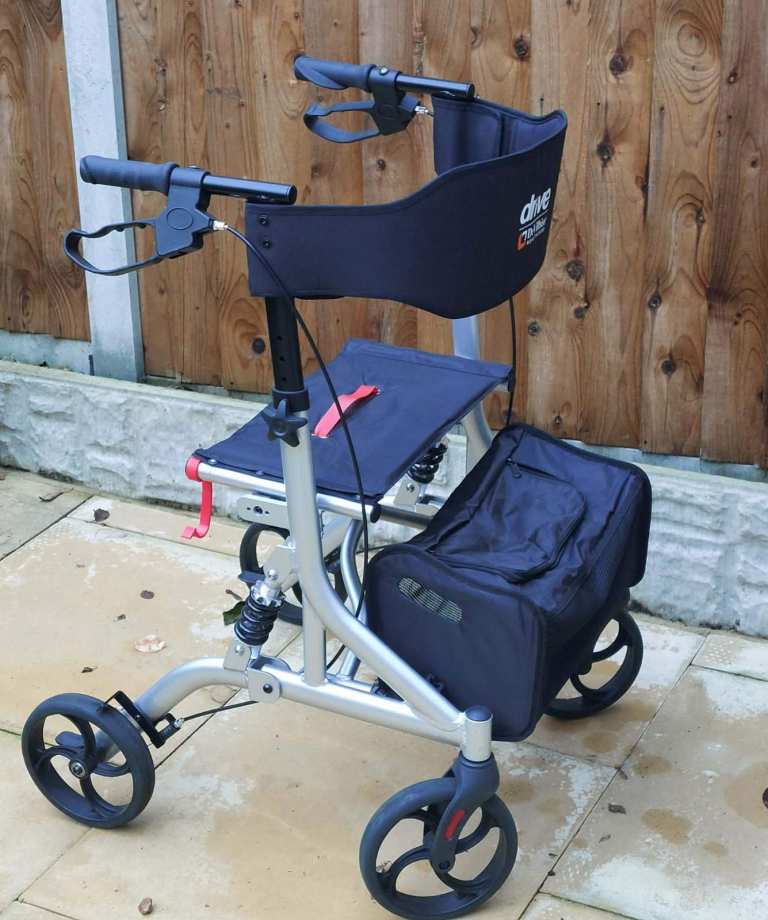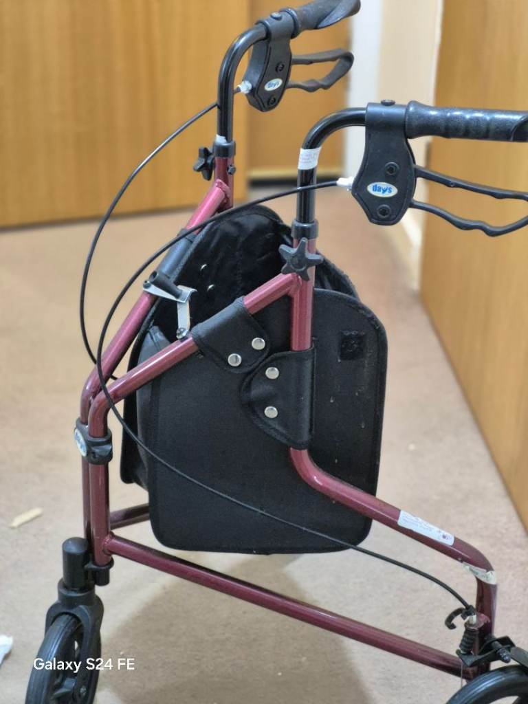 Adjustable 3 wheel mobility aid with pocket for handbag / shopping. Folds up, lightweight. Fits easily into car.
