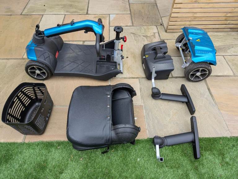 Purchased new in Sep 2024 from Careco, the scooter in is excellent condition having done very few journeys since the original purchase. You will see the protective clear cover over the dashboard is still in place. It is in Aqua Green and comes with charger, manual, front basket and also a bag for the seat back to help carry items such as coats or shopping. The scooter has a speed limit of 4mph with a 25 mile range, it also quickly disassembles for easier transportation in a car. The battery compartment can also be lifted clear of the scooter for easier charging if needed. There is some small damage on one of the arms as shown in the photo.