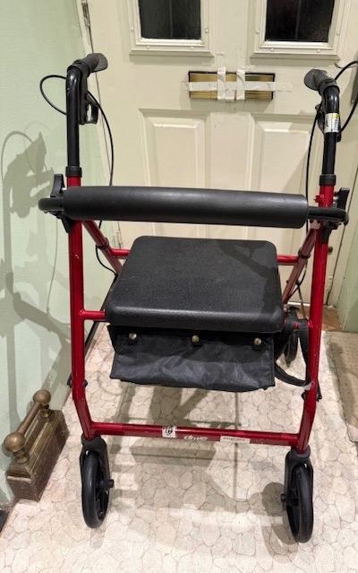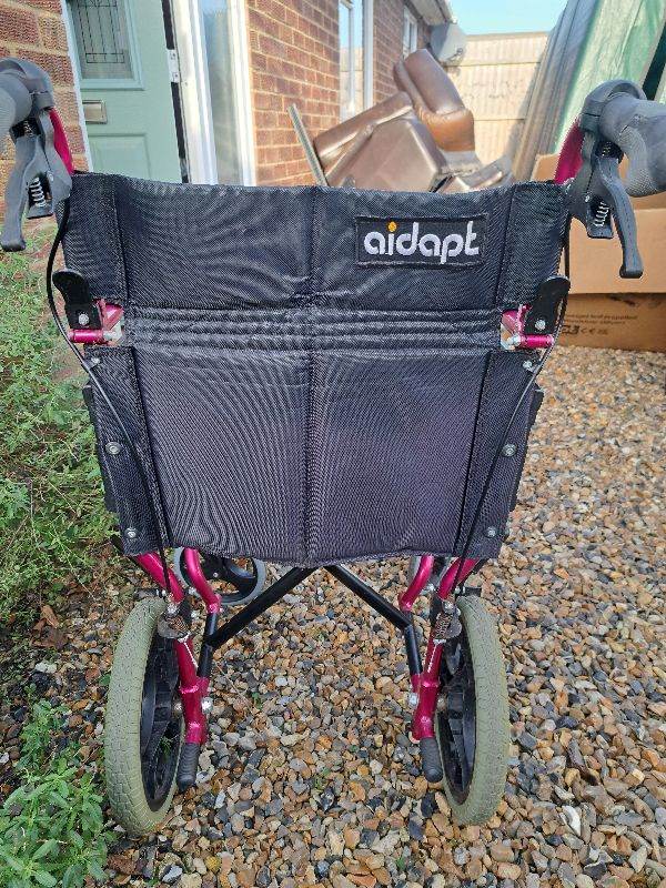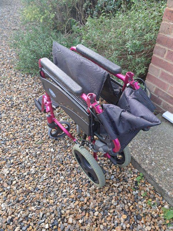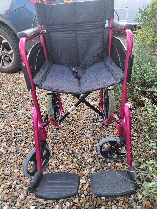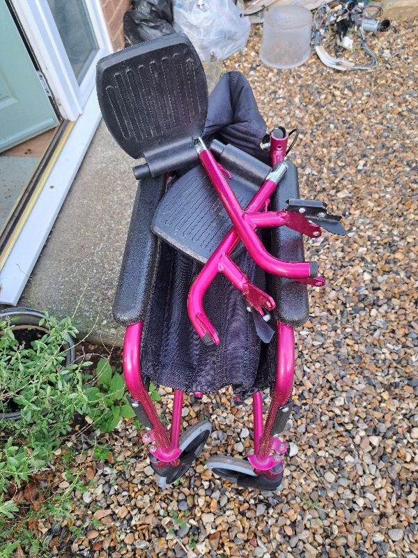 Aidapt pink foldable lightweight wheelchair. With attendant brakes. Fold down handles, removable foot rests and safety strap. Had very little use and is in good condition.
