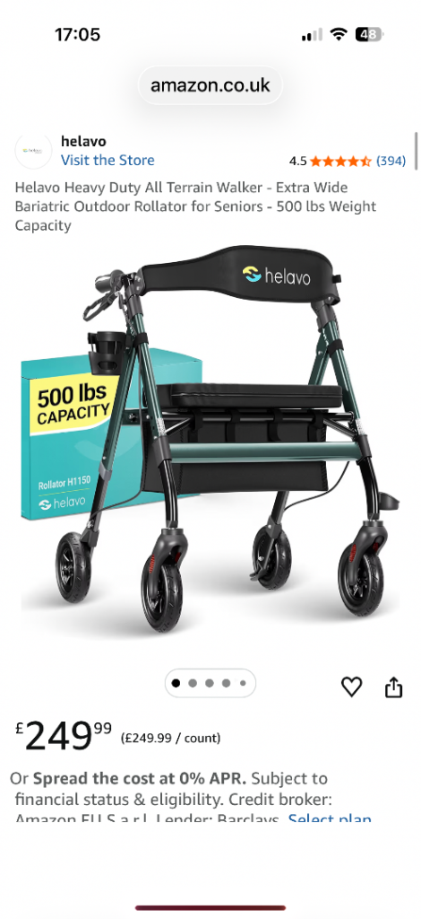 Hi, selling my dad’s rollator. He suffers with Parkinson’s but could not get on with it.