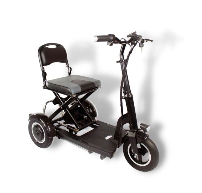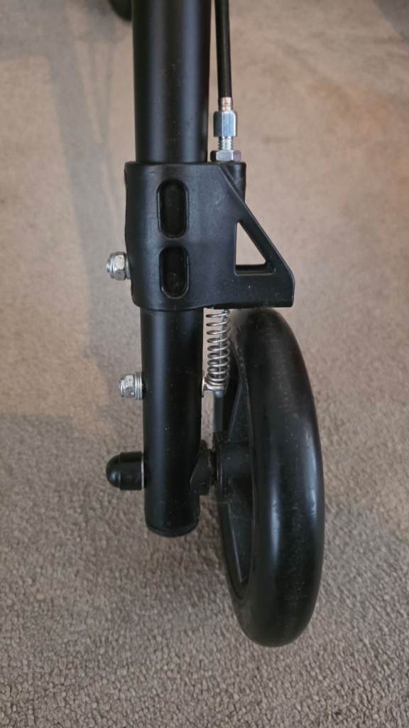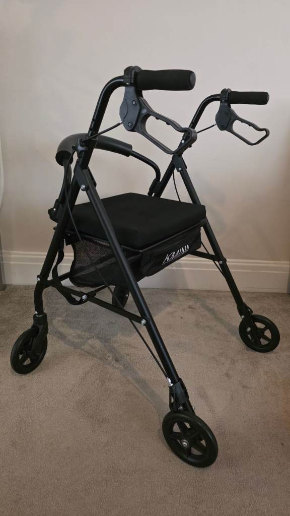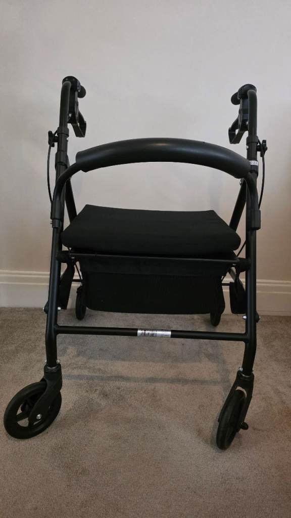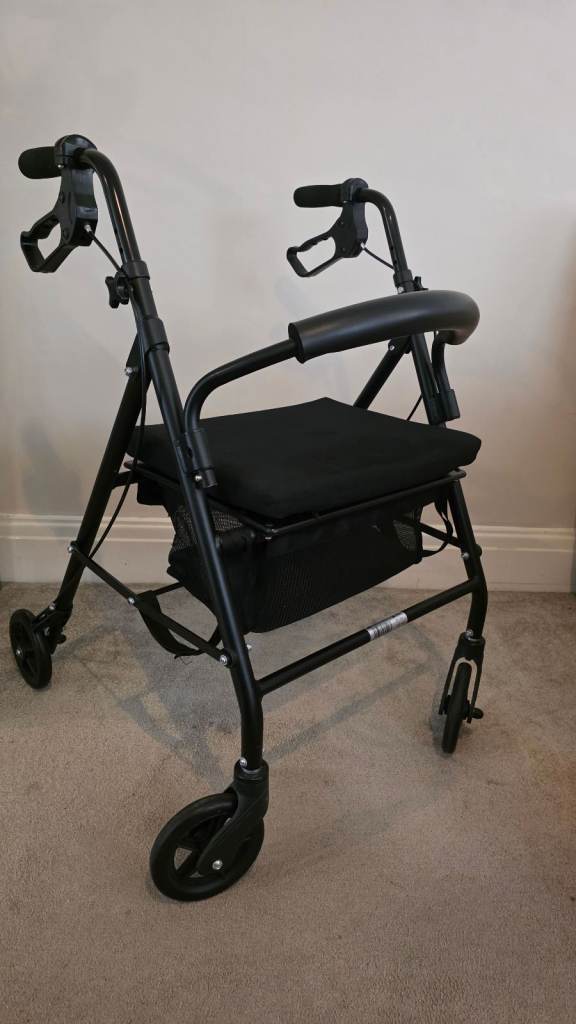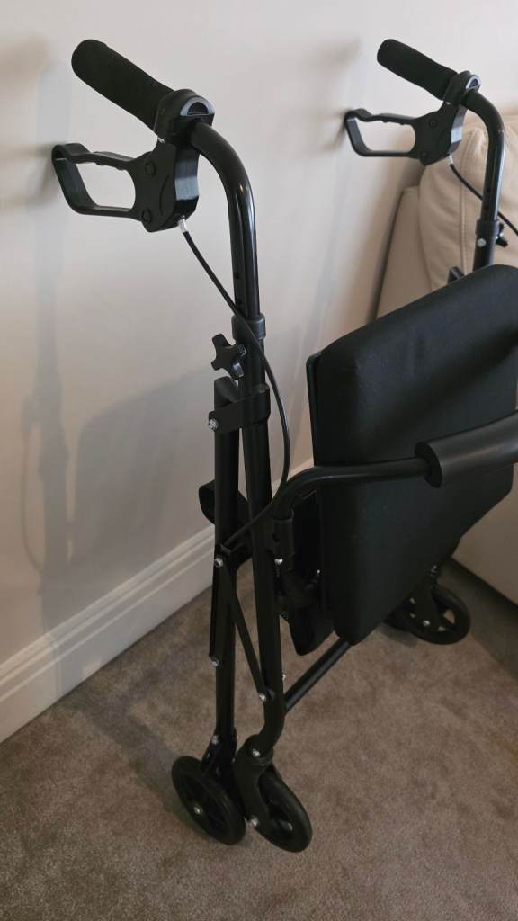 It folds easily for storage or transport. In addition, the walker has a cable brake system that is activated by squeezing the levers and also incorporates a parking brake that prevents the walker from moving when the seat is in use.