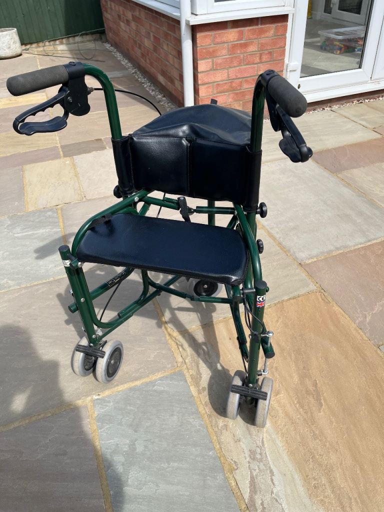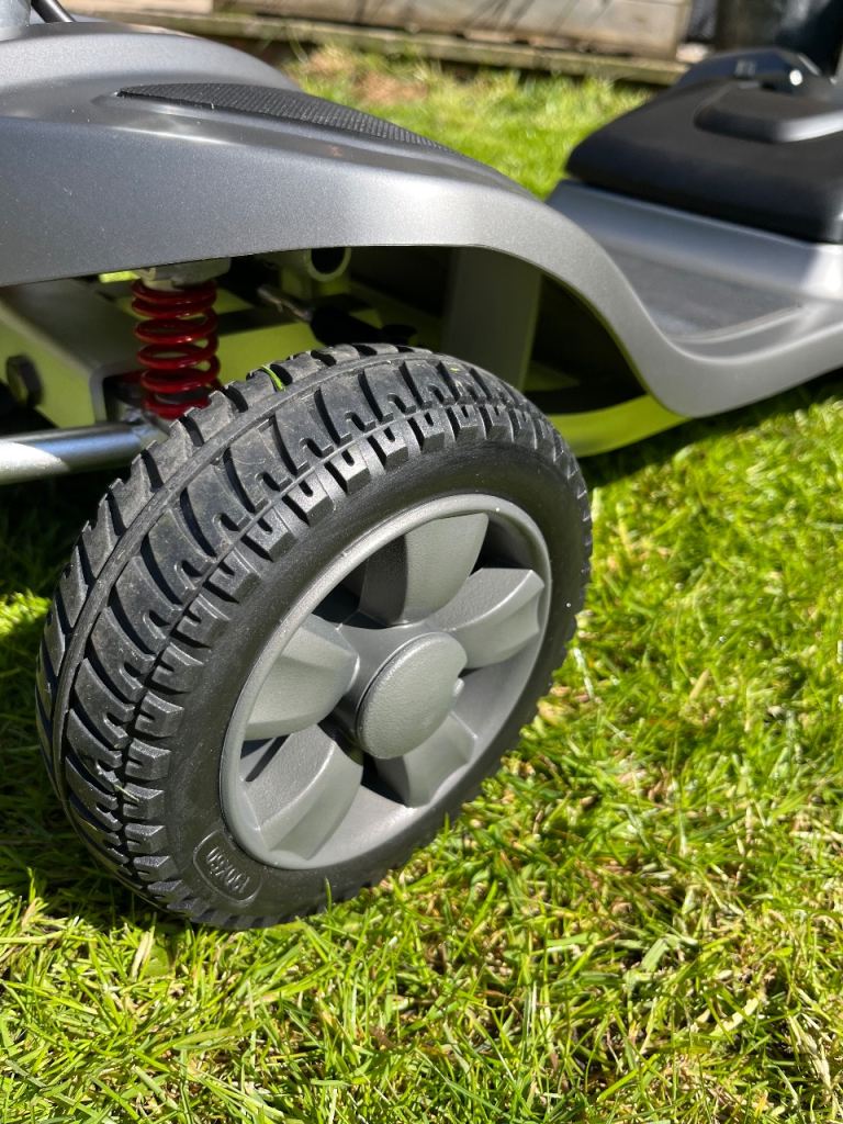 Has solid / non puncturable wheels. The unit easily comes apart to fit in your car boot.