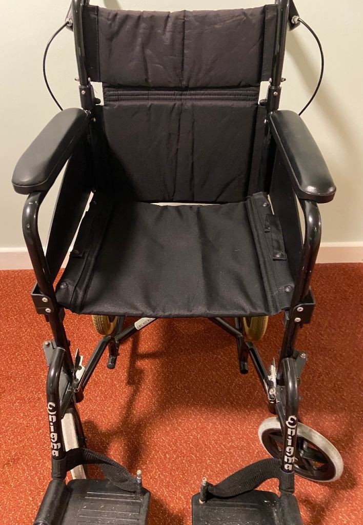 Care co black portable wheelchair VGC wi,th new seat and moulded seat cushion .