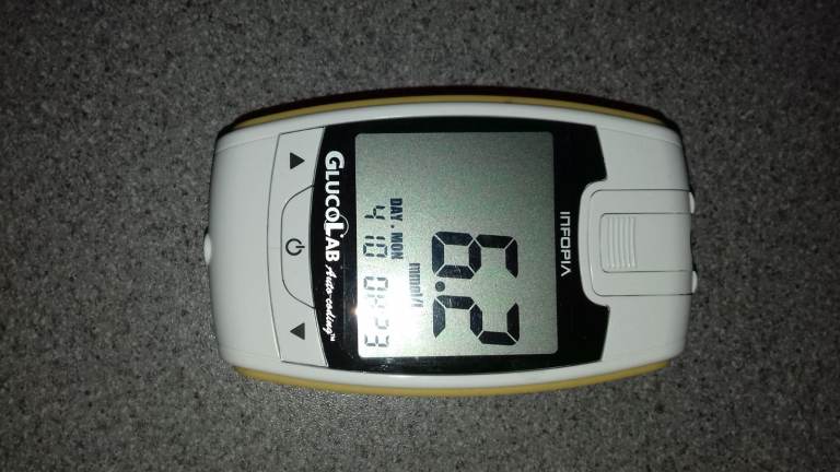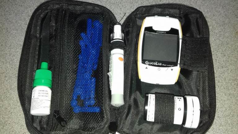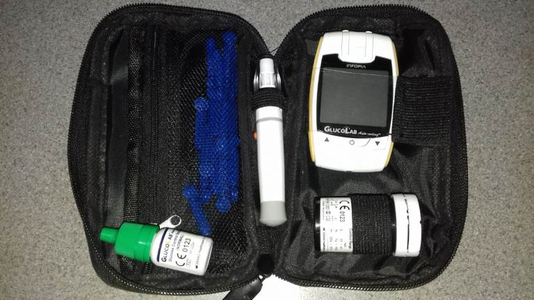 GlucoLab Blood Glucose Monitor with accessories. As new condition, with case, lancing device, lancets, test solution. Complete set - you only need to get the test strips. Just £6 for quick sale.