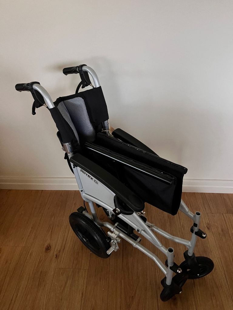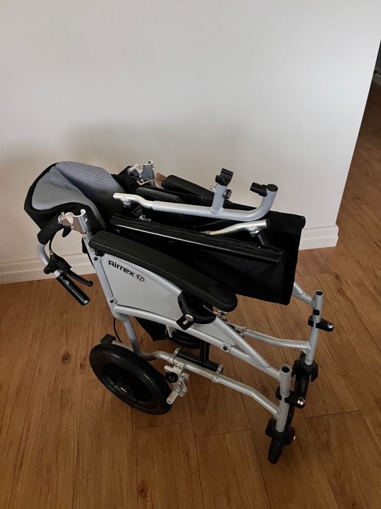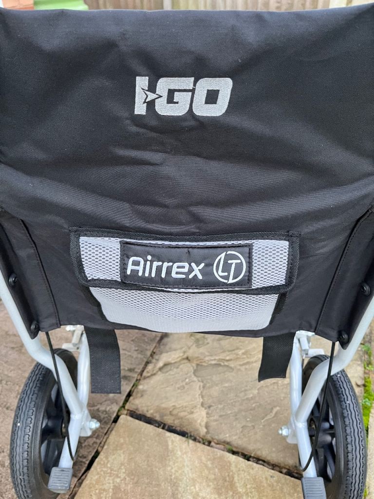 CareCo Airrex LT lightweight folding wheelchair in excellent condition. Sturdy aluminium frame, folds easily for transport or storage, and includes swing-away footrests, attendant brakes, and comfortable padded seat and back support.