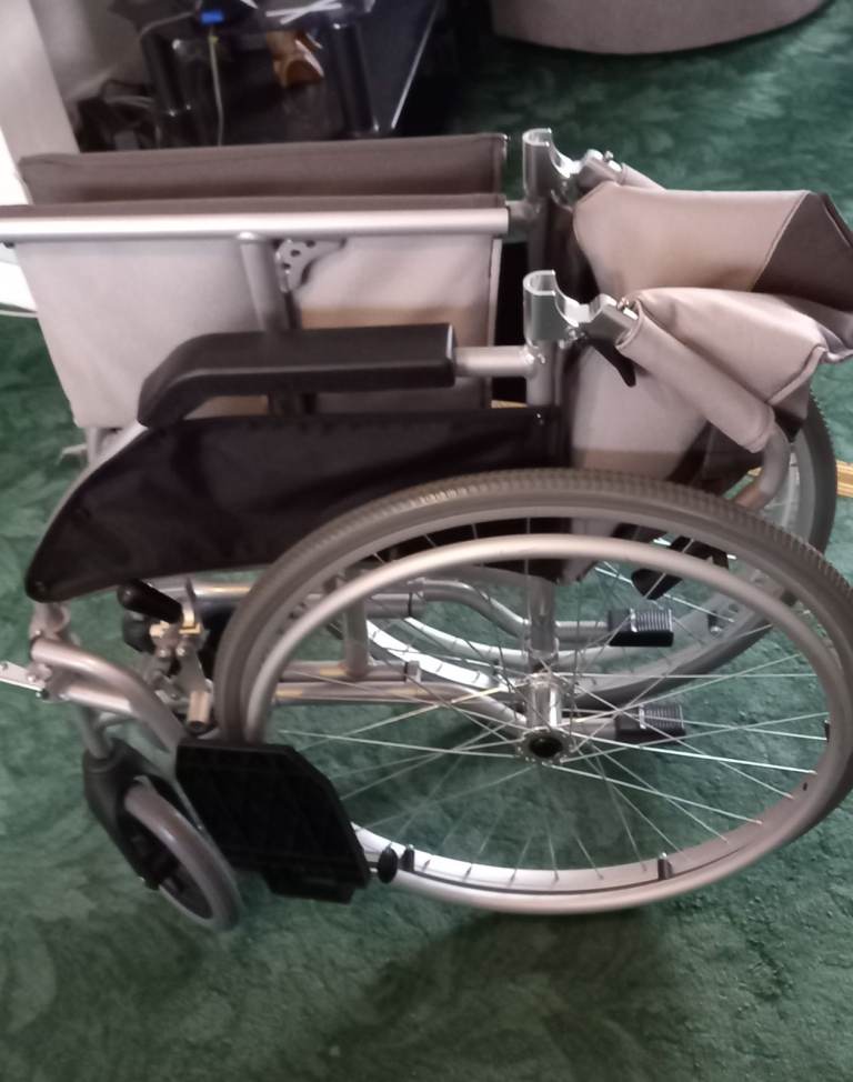 Nearly new, self propelling wheelchair, has brakes at side and on handles, 20" width seat, detachable wheels and feet rests folds down for travel