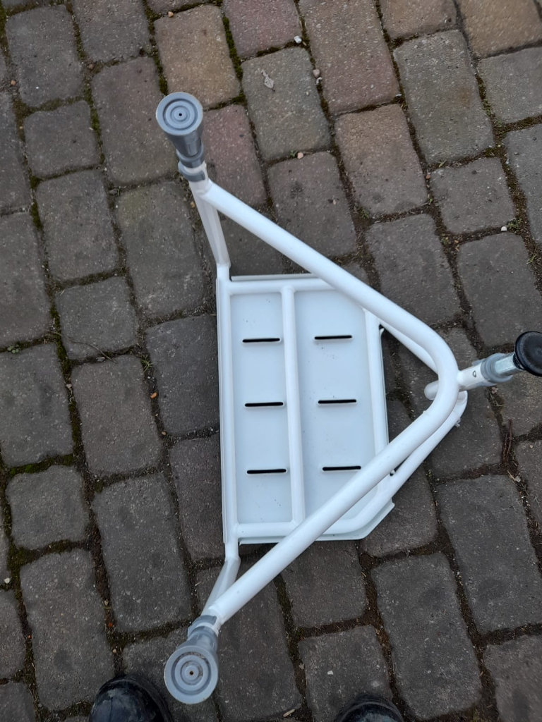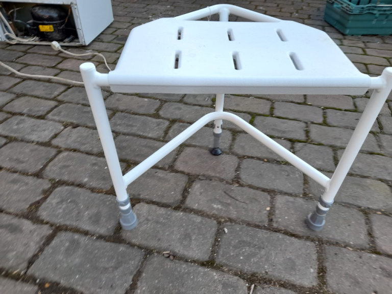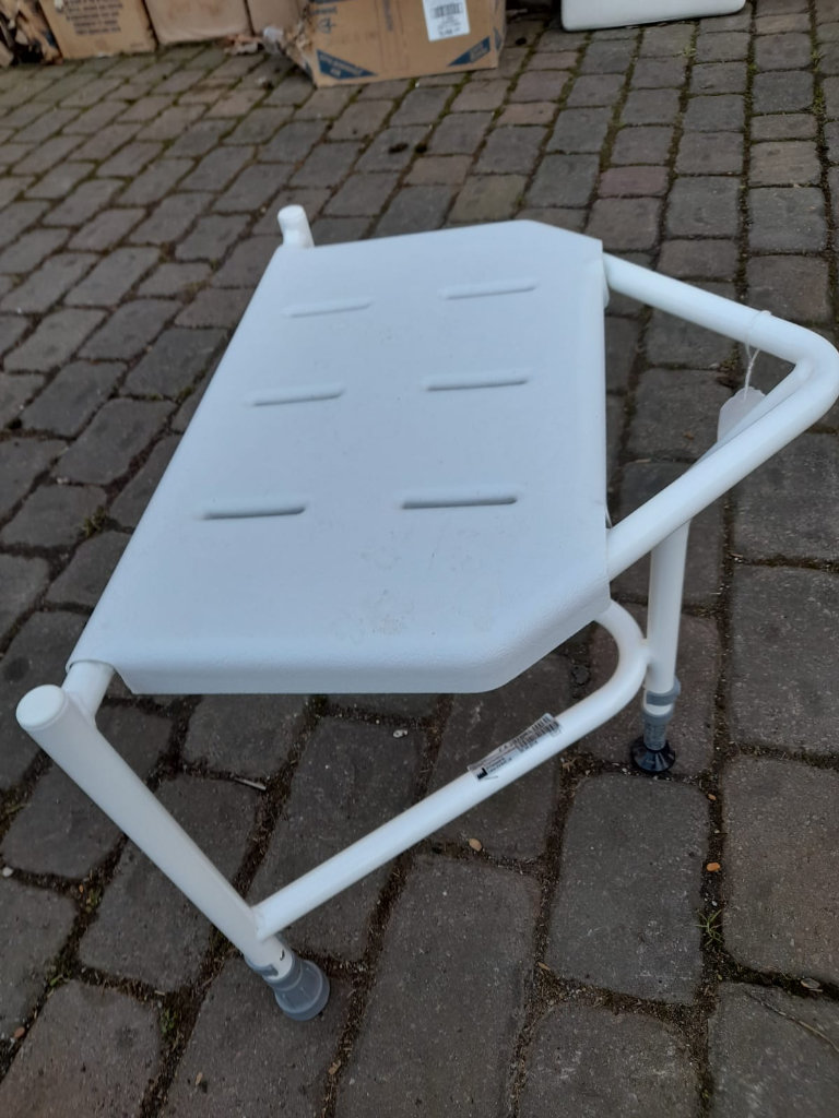 An as new disabled persons shower seat in white with hard plastic base and steel frame measures 20 inches wide by 16 inches high by 16 inches deep. Jayne
