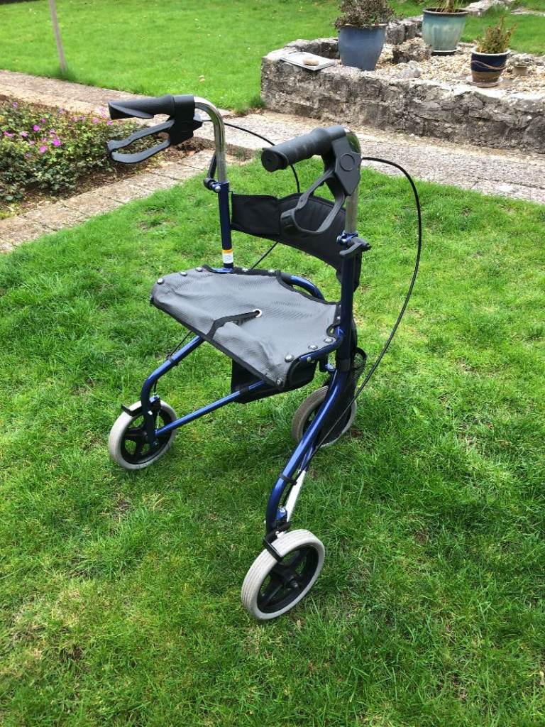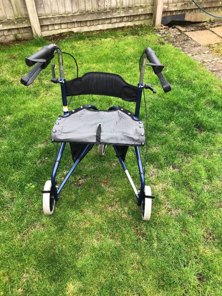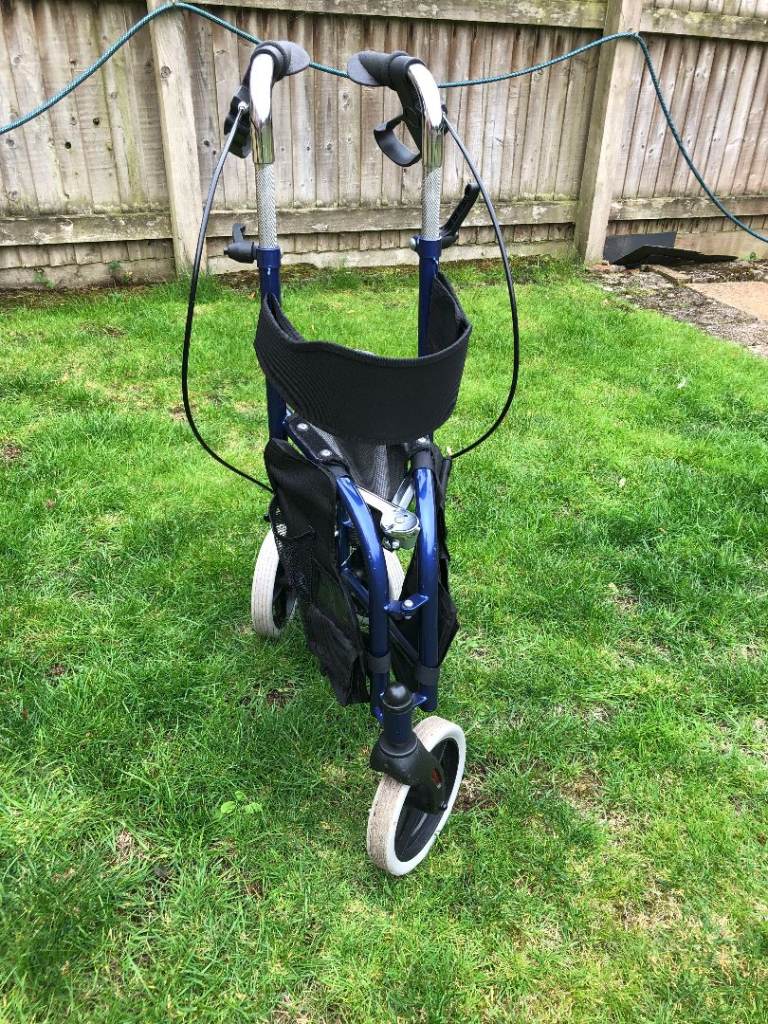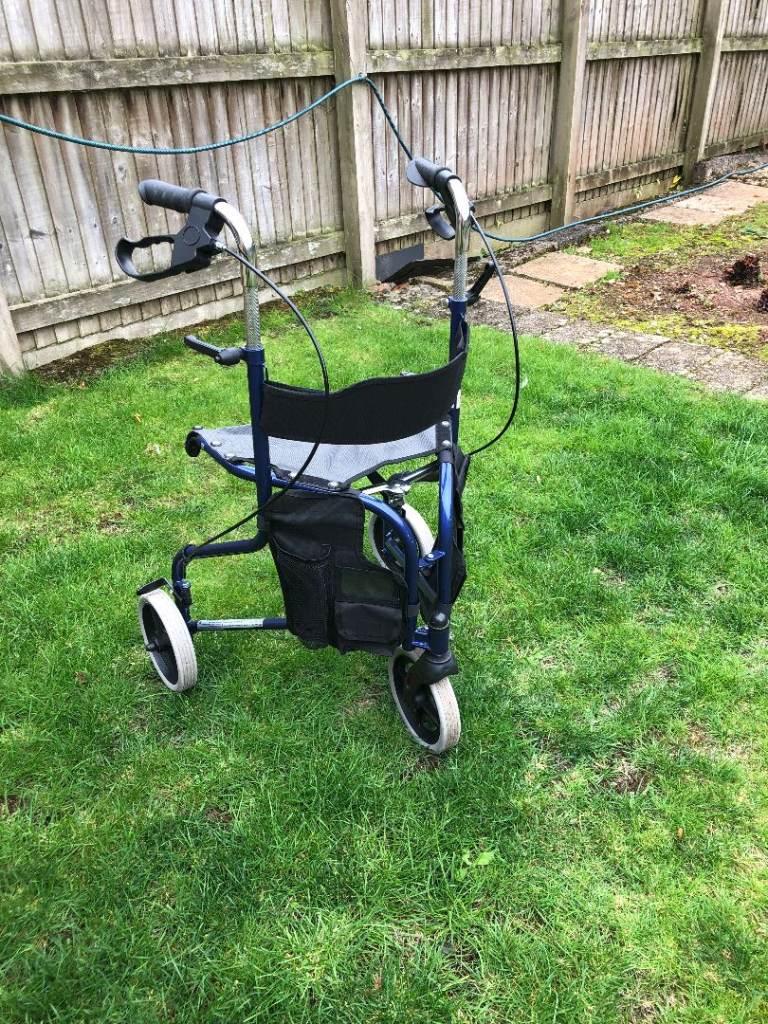 Drive Tri-Walker in Blue. Has seat & storage bags on side.
