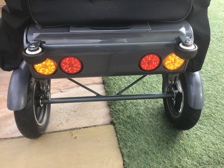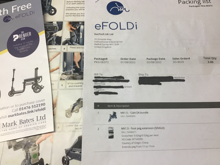 Everything is working as it should, it has a couple of scuffs from usage and storing but works perfectly well, comes with a Lithium charger, keys, quick start guide, double Efoldi cushion for extra comfort, a back pack with walking stick holders as well as the efoldi bag on the back of the seat and two Efoldi foot pedal extensions which slide on and off easily.