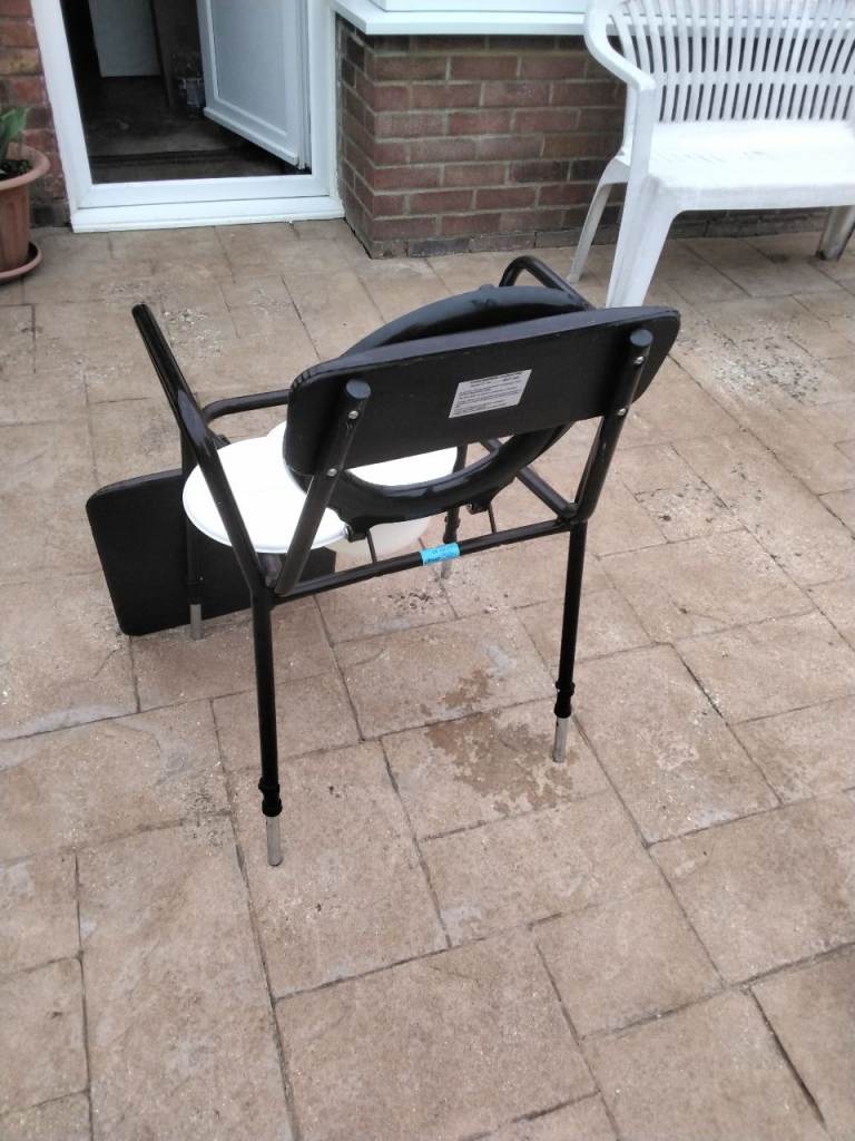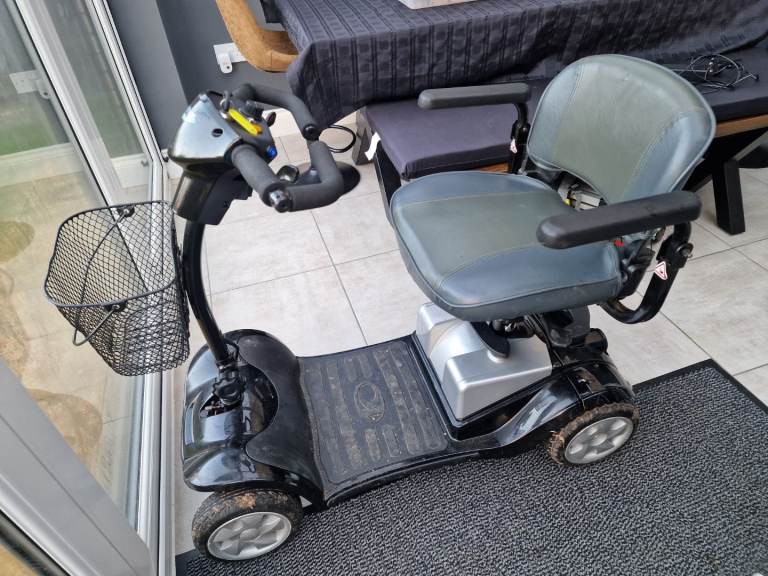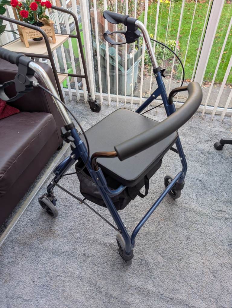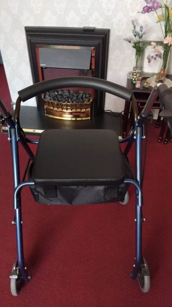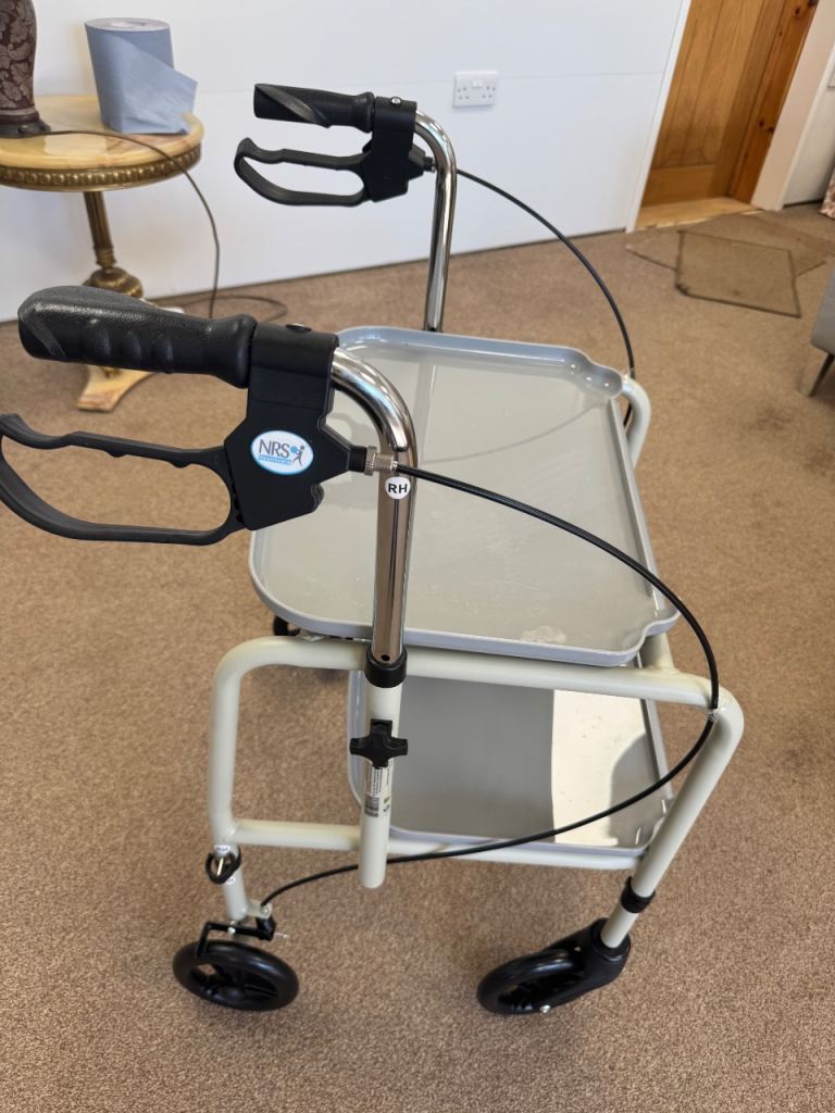 It includes a braking system, accessible via hand grips, with locking wheels for security when stationary.