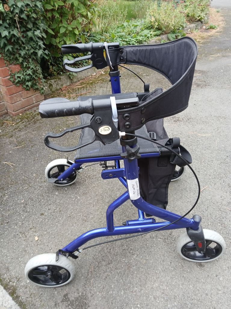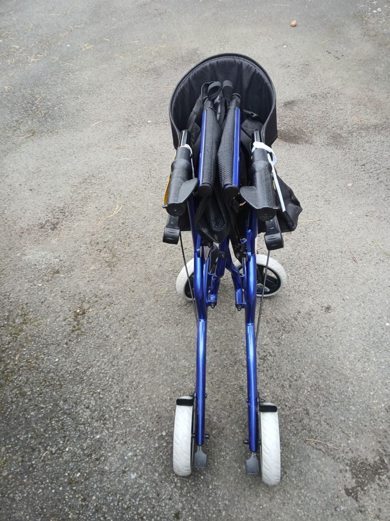 A sturdy and lightweight four wheeled stroller. Lightweight and folds up into a compact unit. Easy to lift to put in the boot of a car.. Very good condition. The stroller has a seat to sit on and small storage bag at the front.