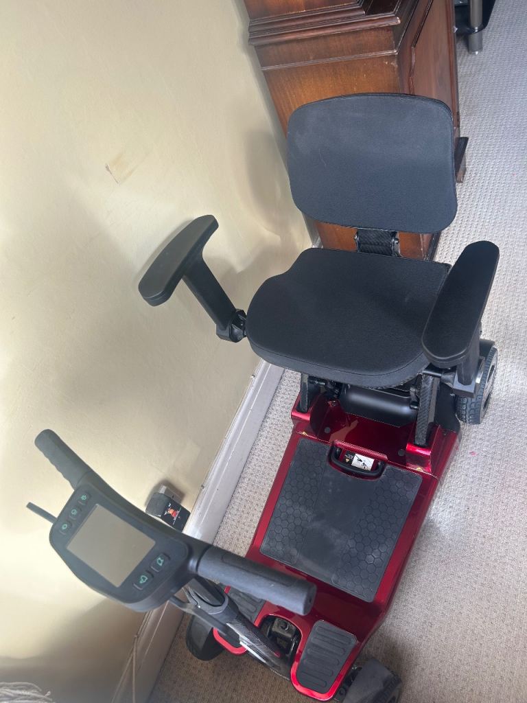 Red pride GoGo Carbon folding mobility scooter. Bought brand new at £4000 & my Dad only managed to use it twice before passing away. Comes with 2 keys, removable battery with charger, light weight & fully closable. Cash only