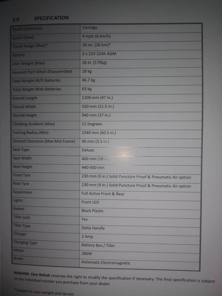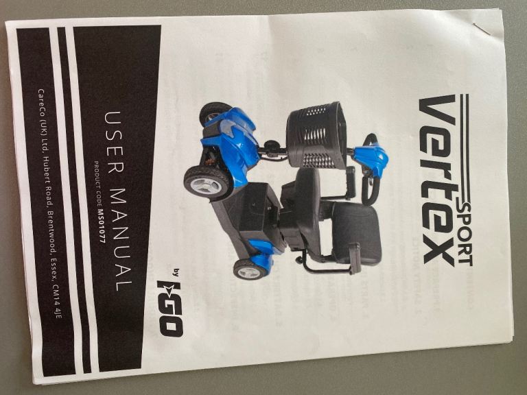 Mobility Scooter breaks down into 5 pieces for transport in most car boots. Full suspension, comes with 2 keys, charger & user manual