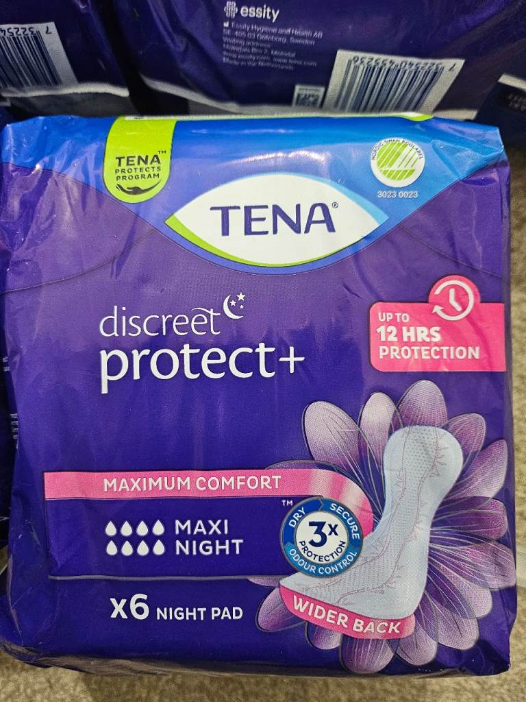14 packs of 6 tena discreet maxi night time pads (unopened). Most absorbant type.