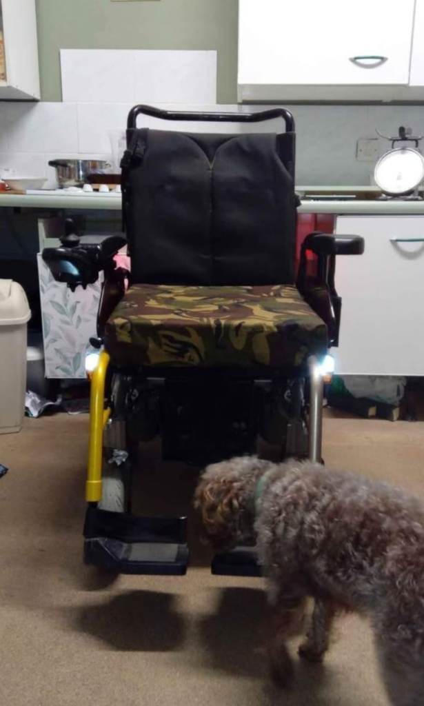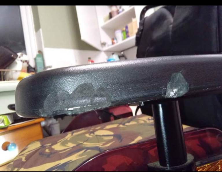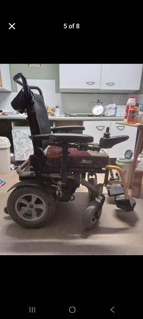 I know cosmetically she doesn't look great, it has been used indoors and out ( hence the battered arm rests ) but she runs fine, charges well, comes with charger, has headlights, indicators, emergency flashers, horn, 5 speeds ranging up to 6mph making it road usable if registered with the dvla.