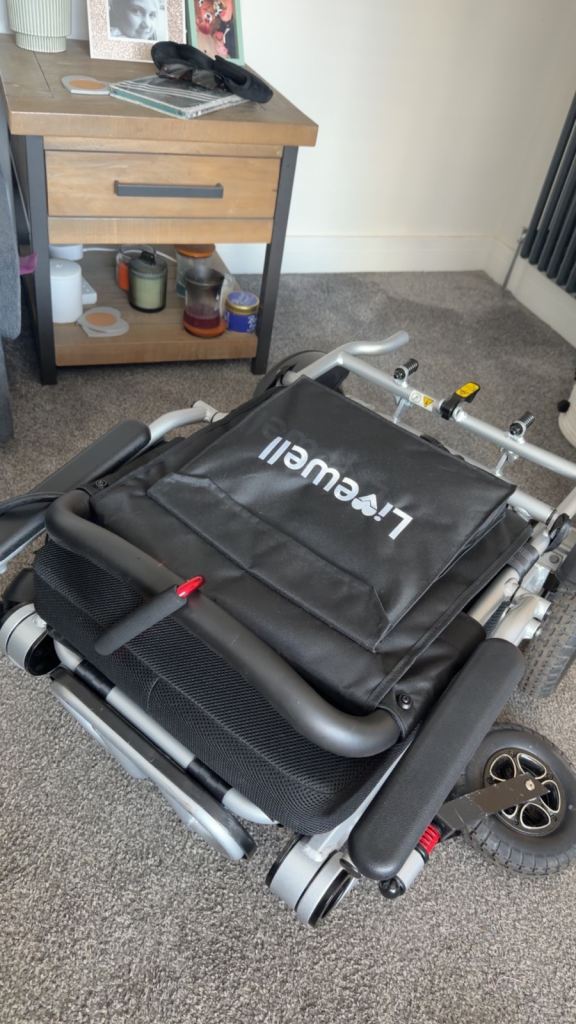 Electric wheelchair by Livewell, fully foldable for easy transport and storage.