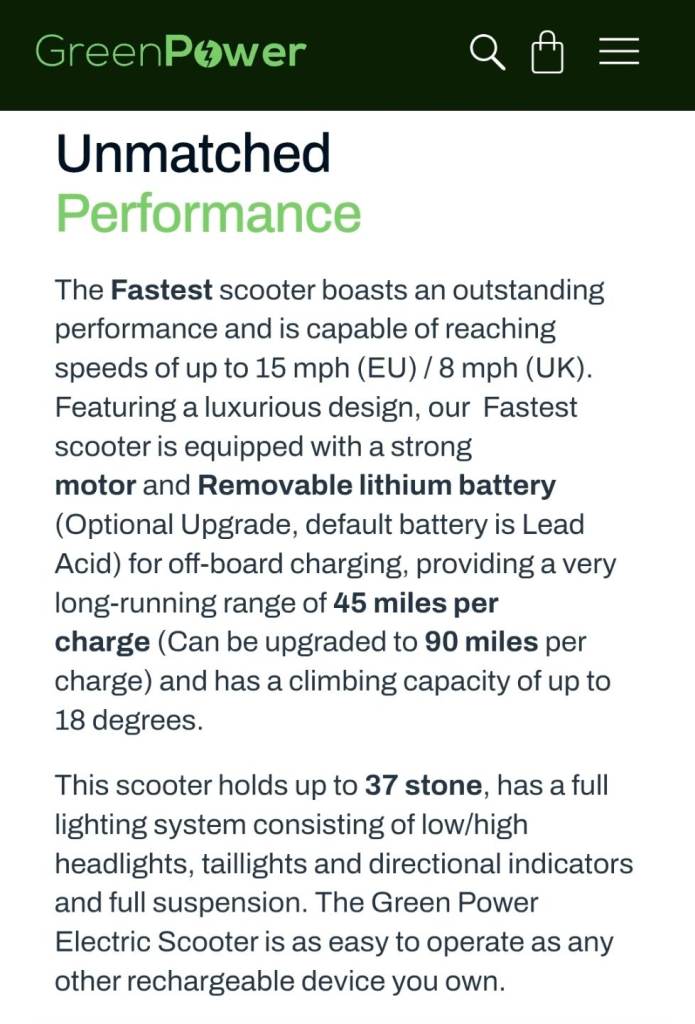 Green Power 'Fastest' electric mobility scooter. Purchased late 2025 and hardly used, on 30 miles travelled. Full details available online.