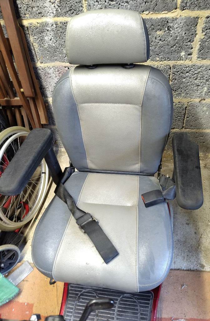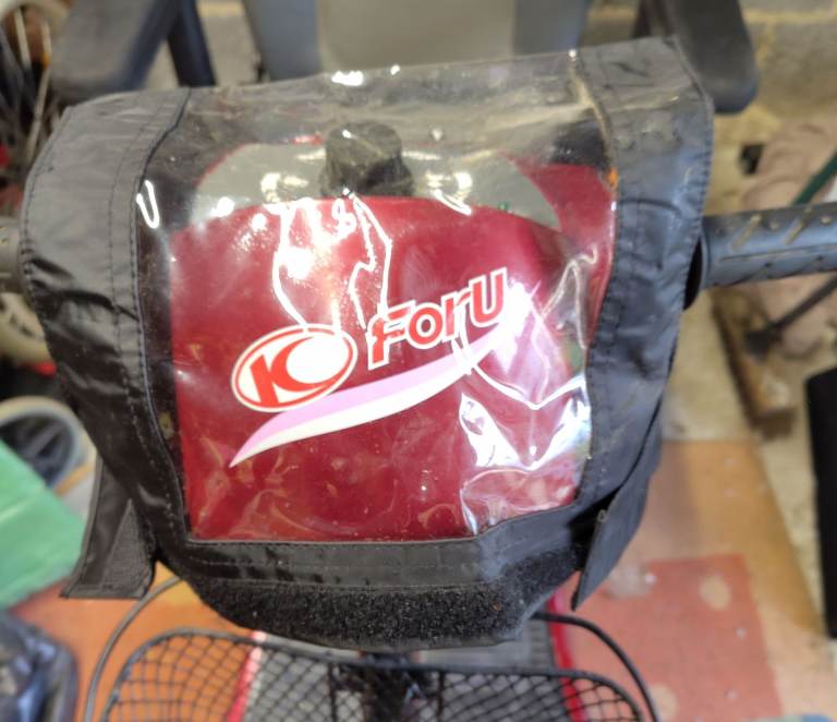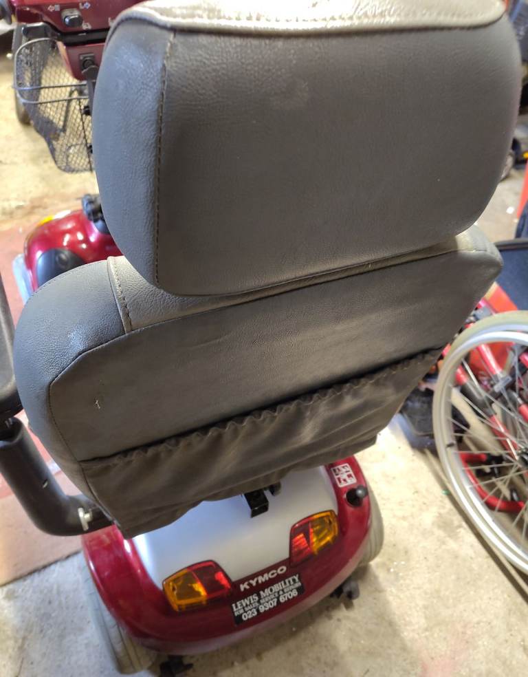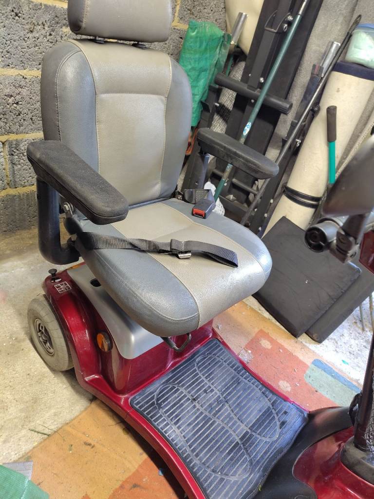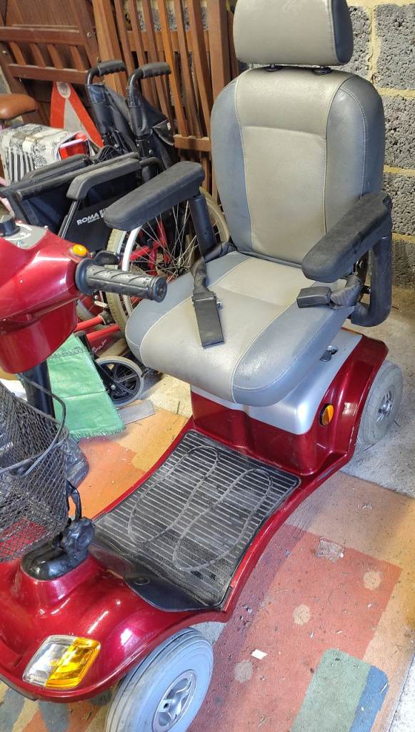 Mobility scooter. Well used and has scuffs and scratches and some damage to the foam on one arm, hence price. Still works fine. Includes removable rain cover for the control panel. Please see all pics for condition.
