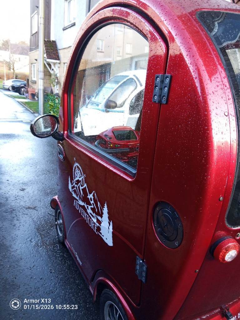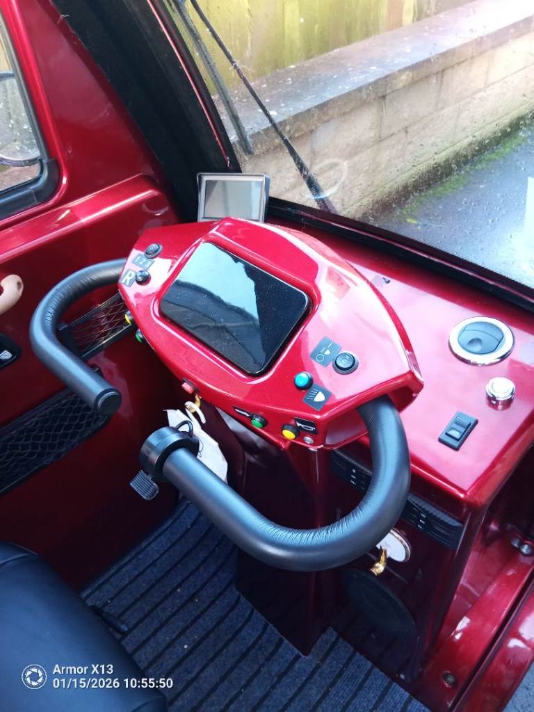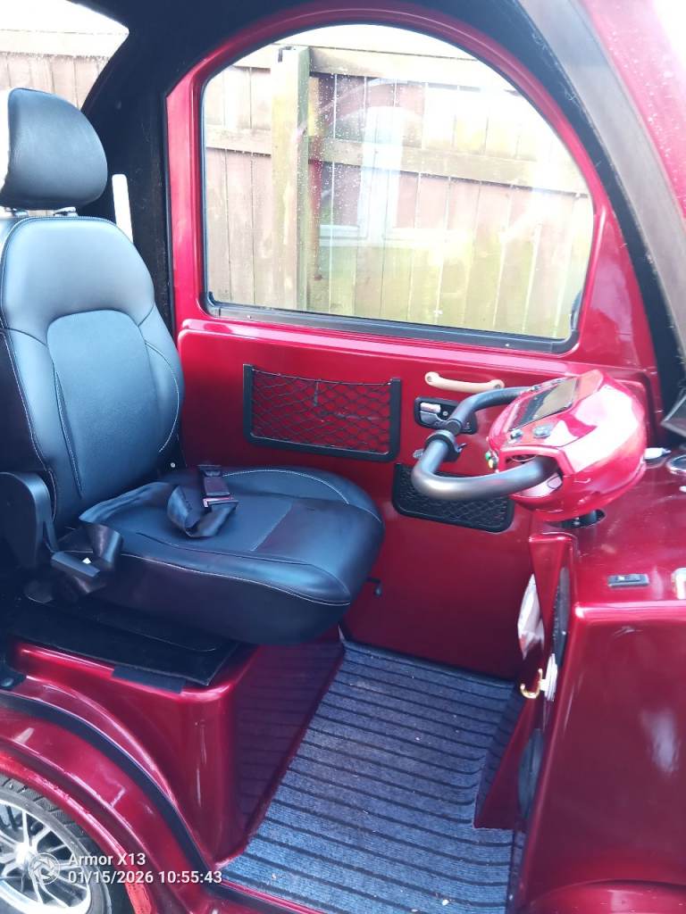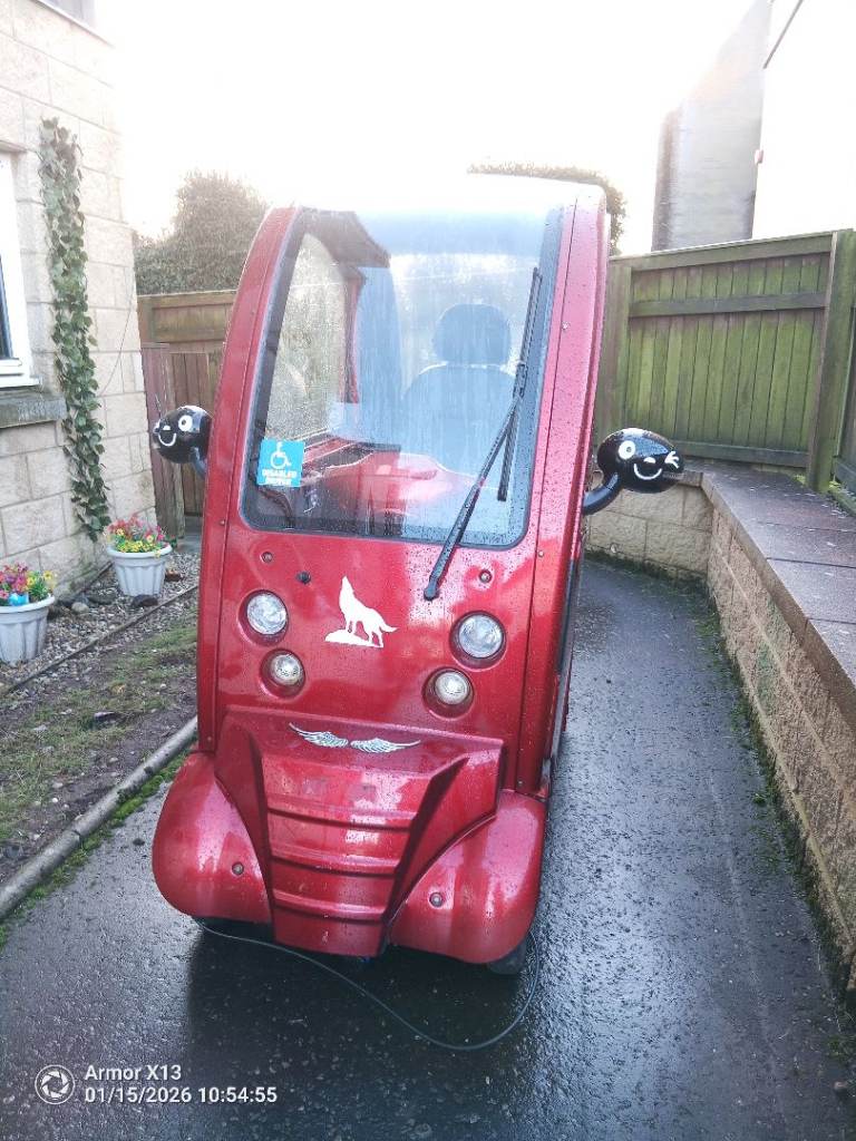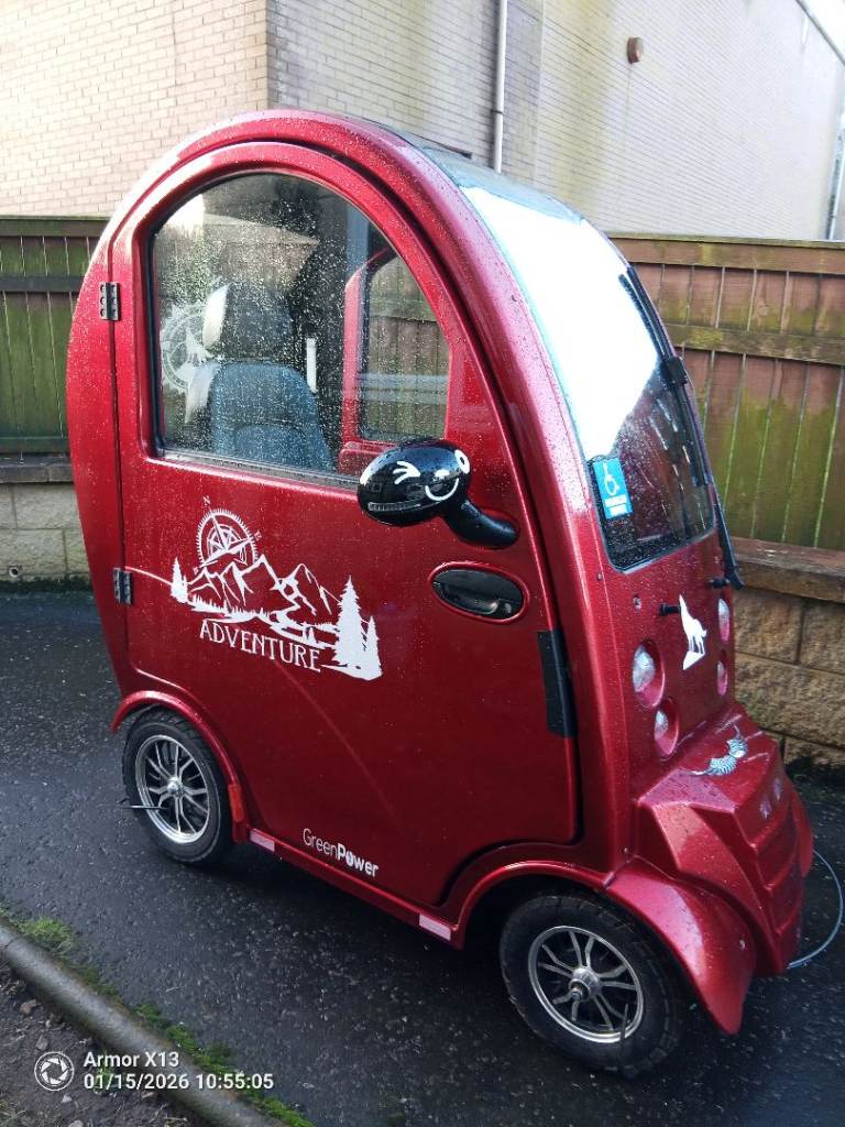 Much loved Mobility scooter cabin car for sale. Has heating, central locking, windscreen wiper, rear reverse camera with monitor on dashboard, usb port, radio, indicators, head lights, back lights. It takes 1 battery at a time but there are 2 batteries that come with it plus charger. It goes 2,4 or 8 miles an hour. Probably about 10 miles on a full charge if not abit more, all depends on the speed, more speed more battery is consumed. Selling due to upgrade. Has a loud security alarm on it also. Falkirk,Hallglen area, collection only. Payed £4000 for it so selling for £2000 ONO. Quick sale.