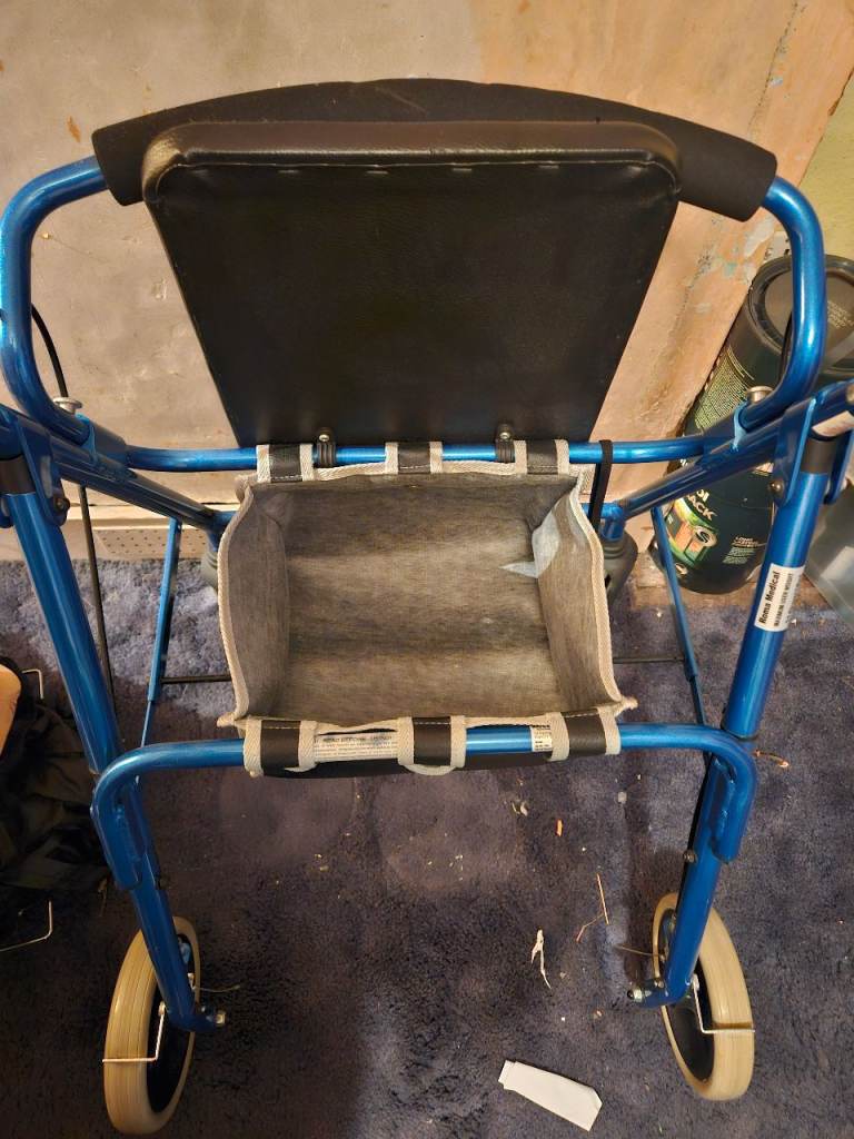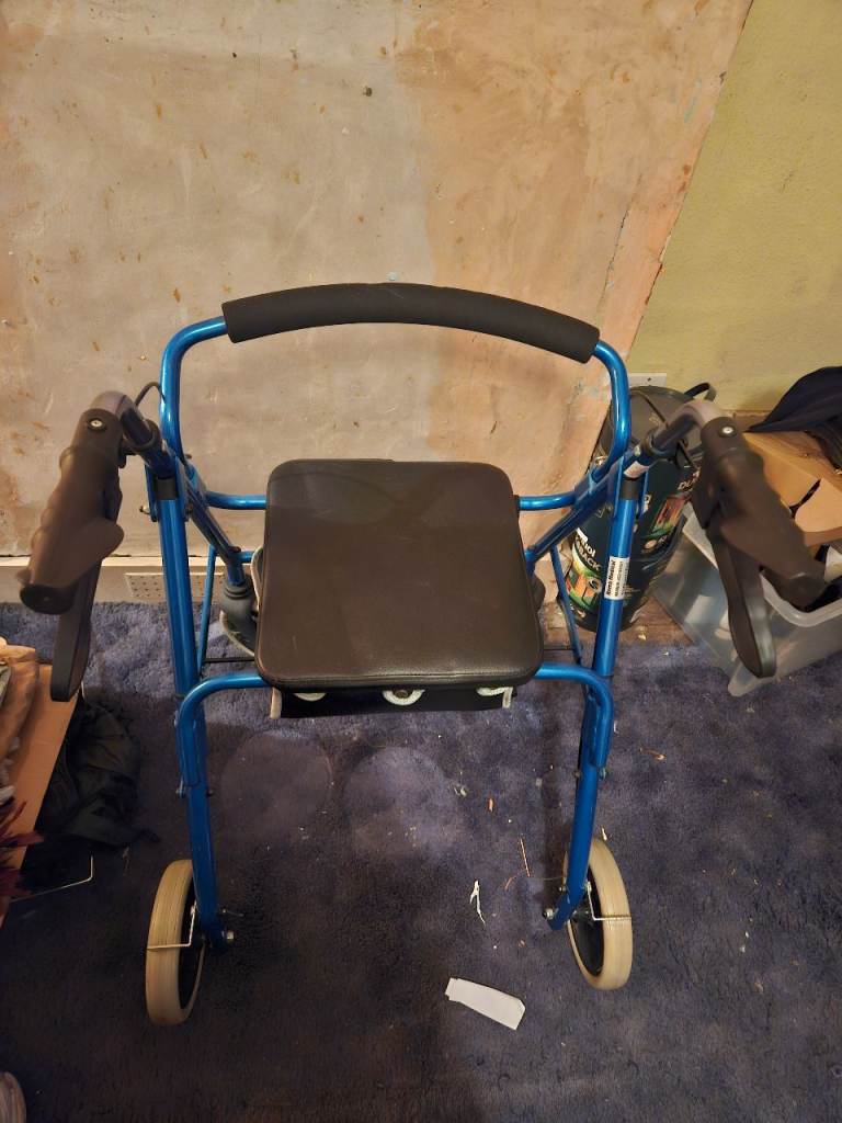 Blue Mobility walker in good condition has four wheels has brakes and seat to sit on and storage under the seat