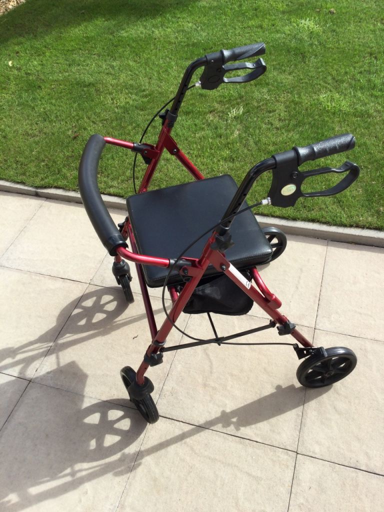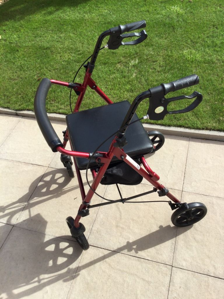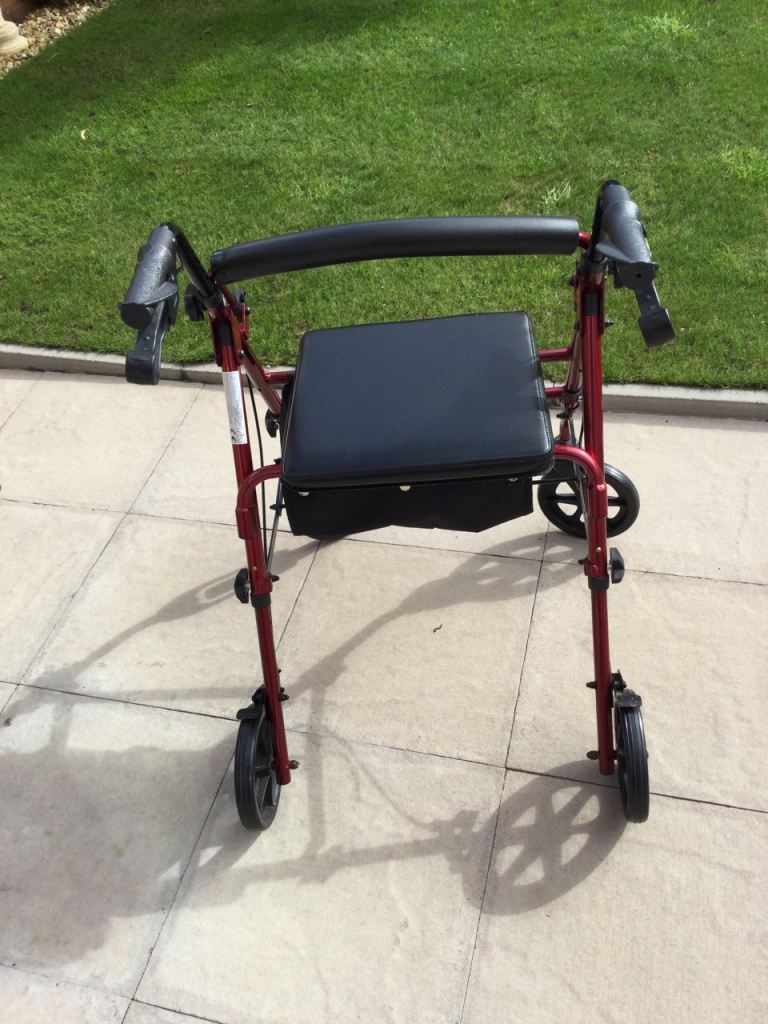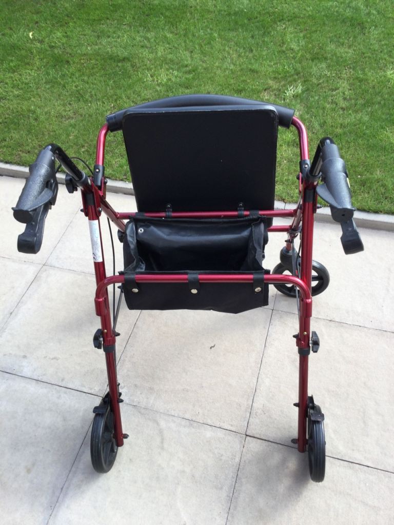 Four wheel mobility walker with seat and for storage,
