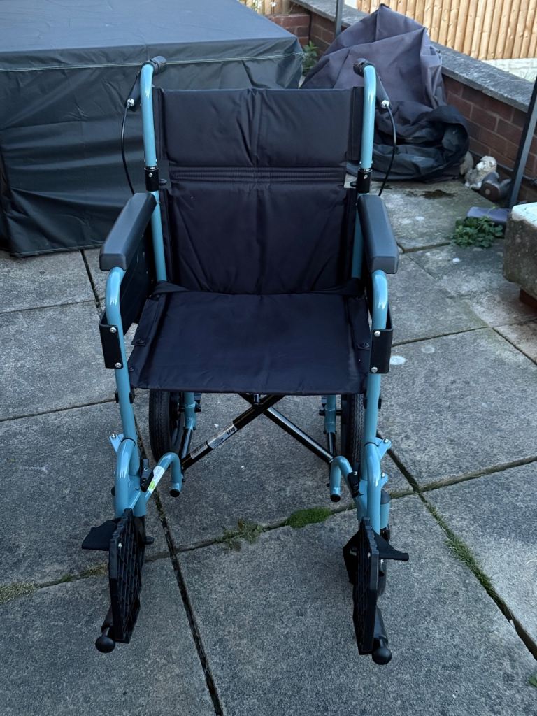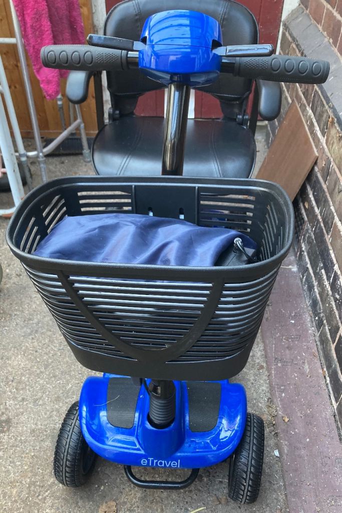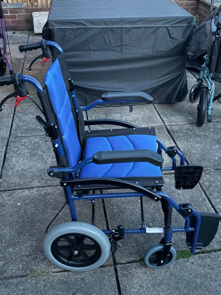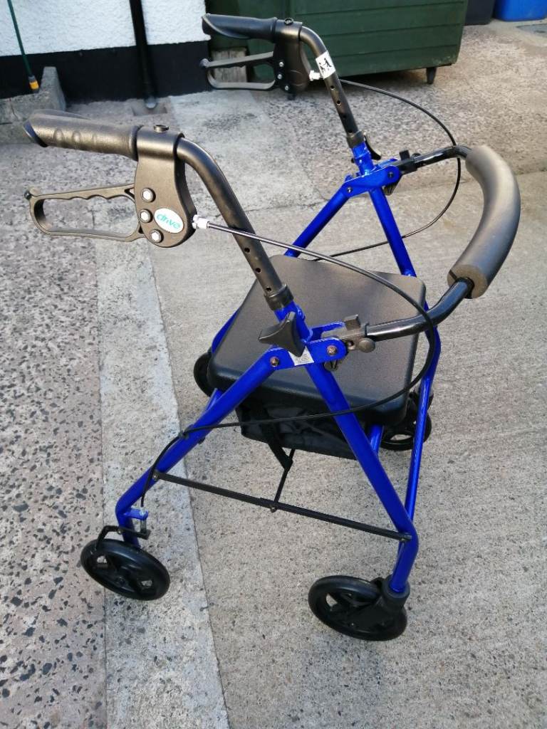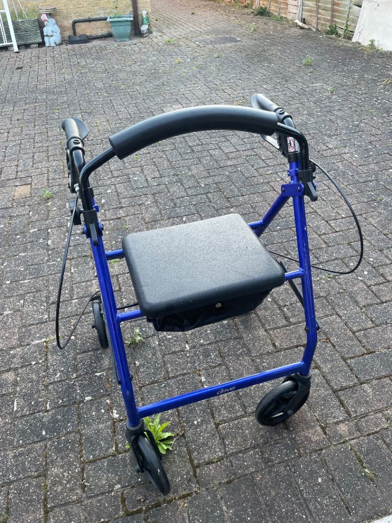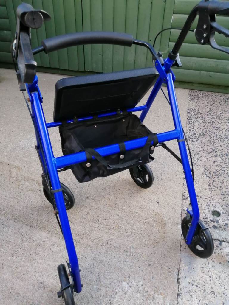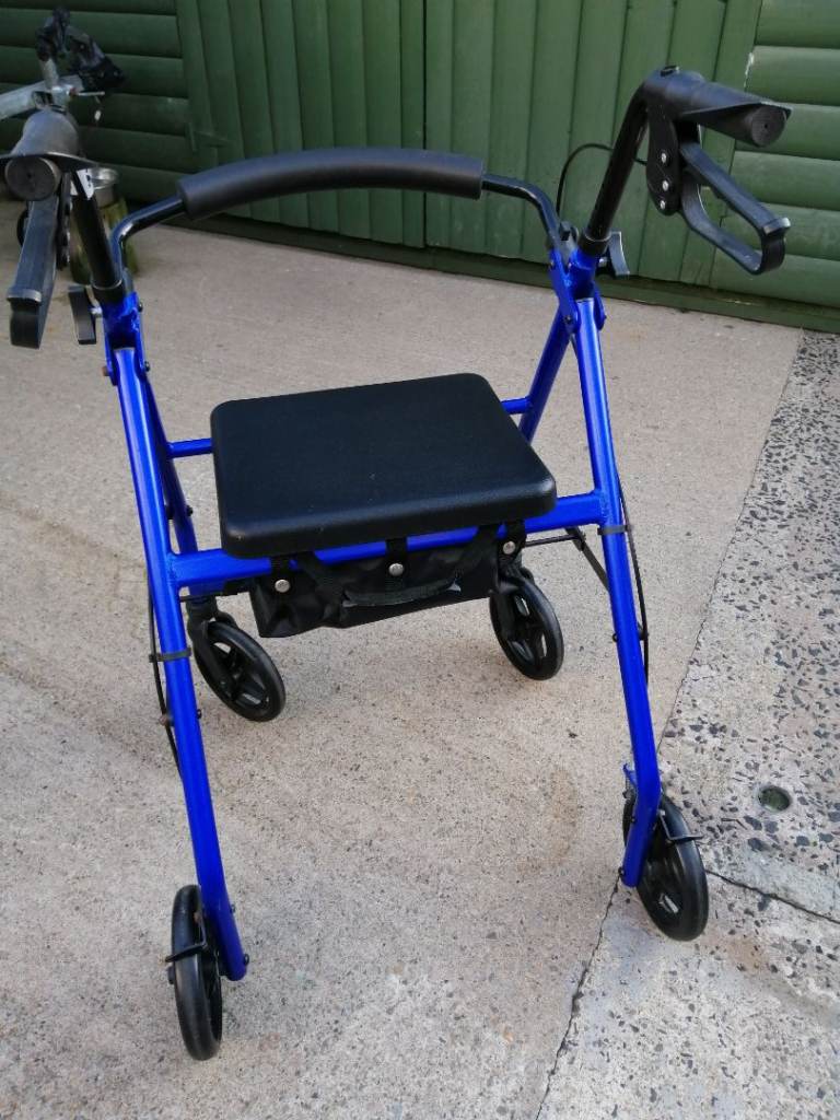 Blue mobility walker with seat and storage underneath. In very good condition.