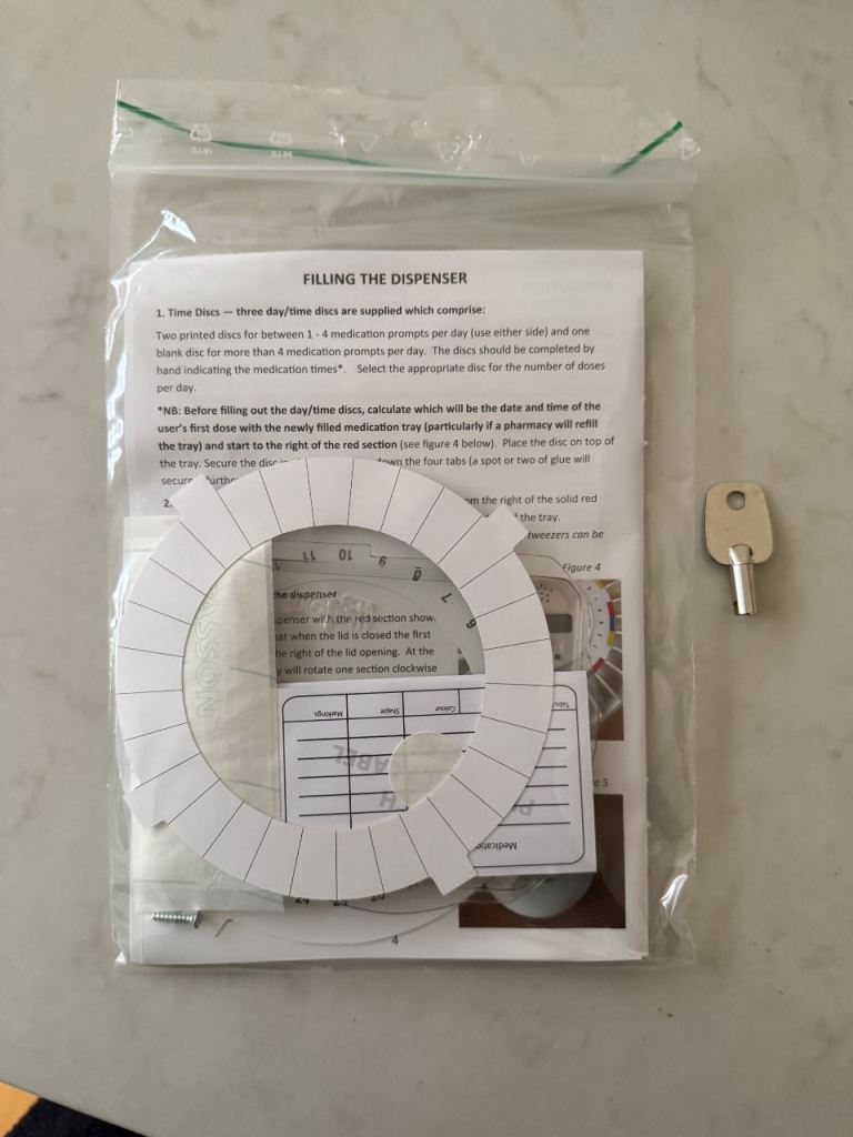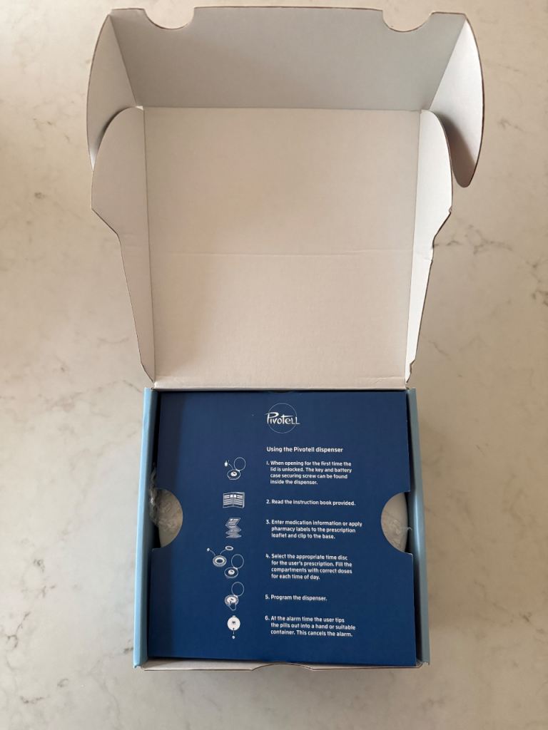 Easy to use - 3 button programming allows dosing at pre set times, the alarm sounds, light flashes and pills dispensed. The alarm is cancelled by turning the device over