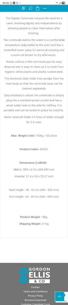 The portable Wash & Dry dignity bidet commode by Gordon Ellis is a floor-standing with pressure assisted flushing technology. It features a standard shaped bowl making it suitable for any bathroom. It is completely portable making it easy to move from room to room. Also features a heated seat and touchless operation providing a convenient and hygienic experience for the user. The white colour adds a sleek and modern touch to a bathroom.