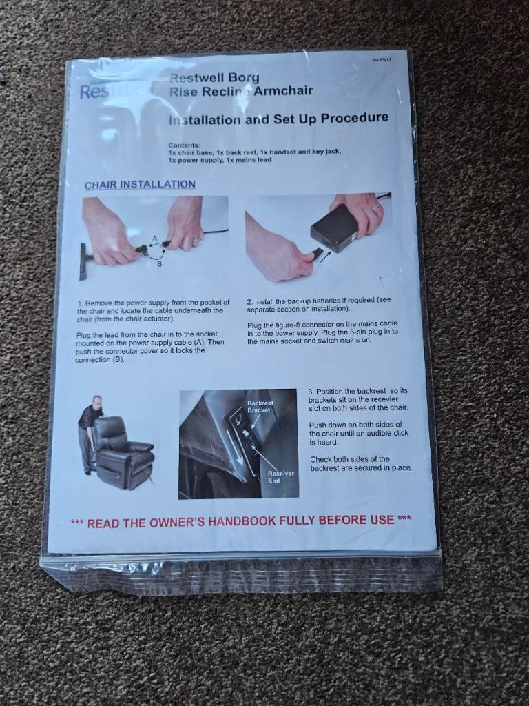 Raise and recliner chair in good condition a little bit of wear on the head rest but I have shown it in the photos. All in working condition