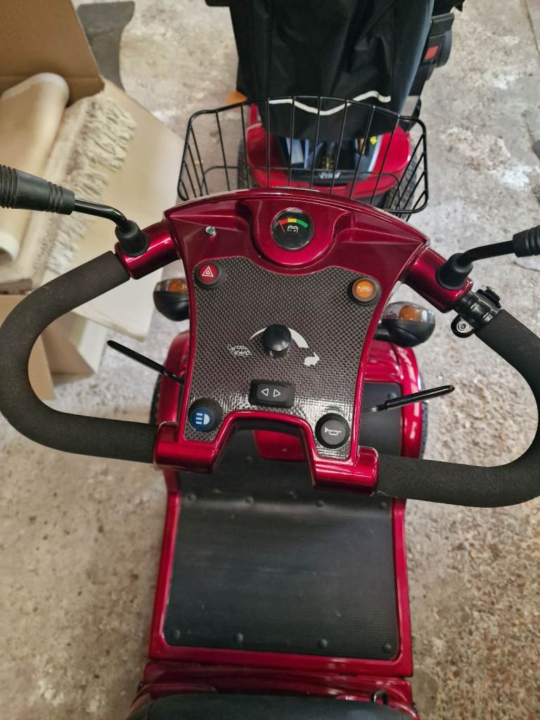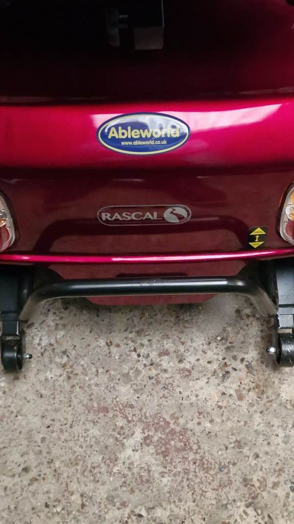 Red Rascal pioneer mobility scooter. Registered for road use until 26 Aug 2026. Excellent condition limited use. Wing mirrors, indicators etc. Max speed 8mph. 4 years old. Paid £2295 new