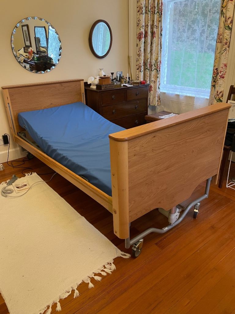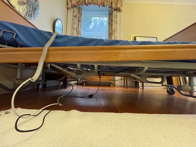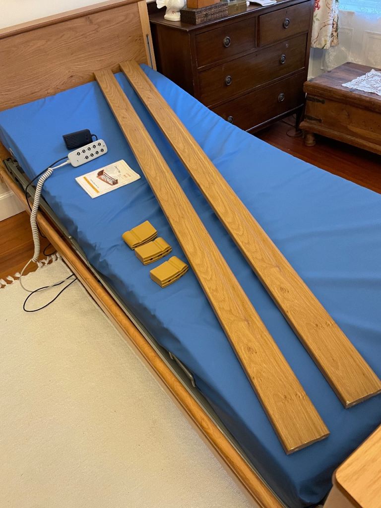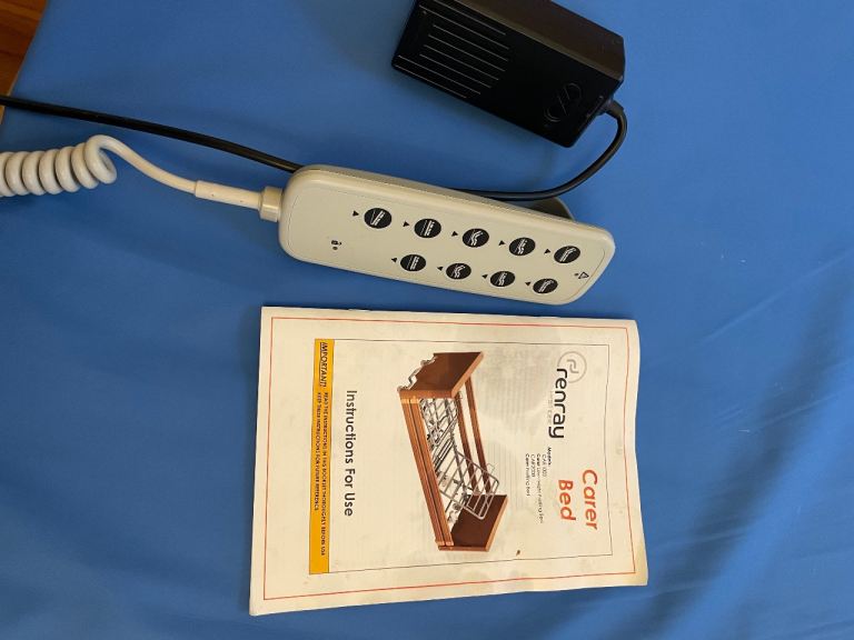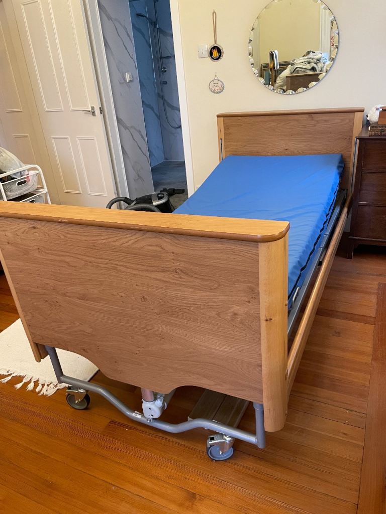 Carer electric profiling bed. Four section electrical low bed. 20 - 60 cm height range. Complete with aesthetically pleasing wooden ends and full length wooded side rails in Pippy Oak. Elite pressure reducing mattress up to very high risk. Maximum weight 120kg. Engineered foam, cover 2 way stretch, vapour permeable polyurethane coated material 1980mm x 880mm x 150mm. Corus egress handle. Very lightly used. User mow in care home.