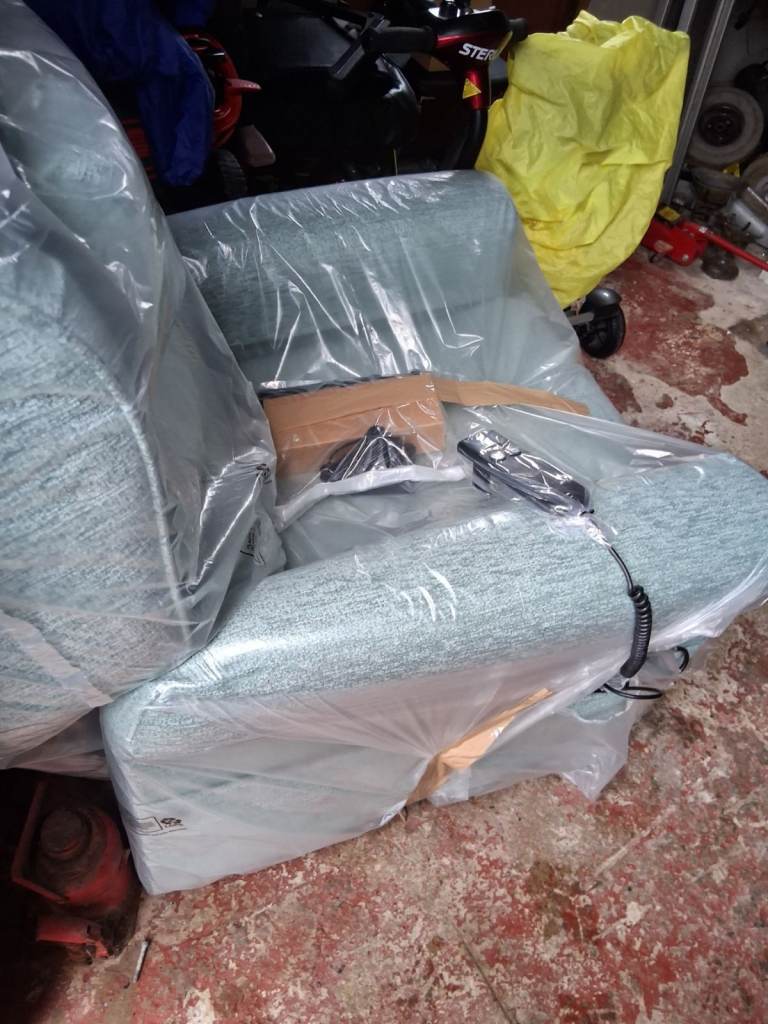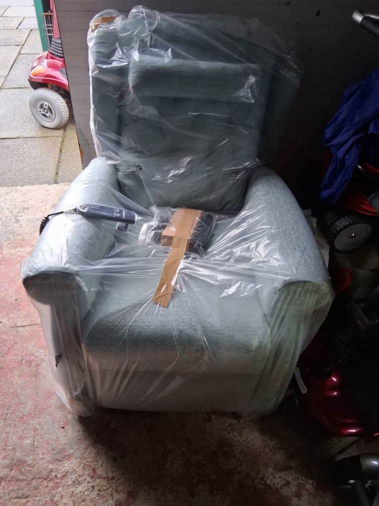 RISE AND RECLINIG CHAIR BRAND NEW WITH HEATED SEAT ON THE CHAIR CHAIR LIHT BLUE BRAND NEW STILL GOT RAPING ON