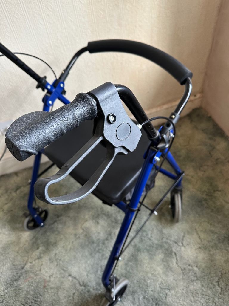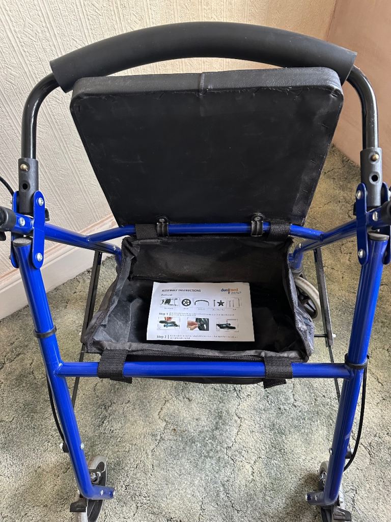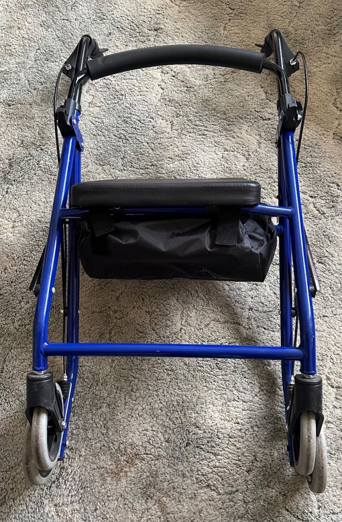 A walking aid combined with a seat and storage area. Brakes are provided and the wheels can be locked. Handle height is adjustable.
