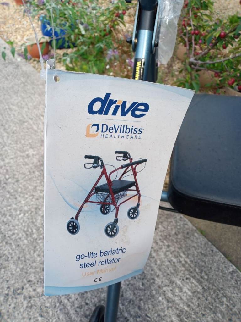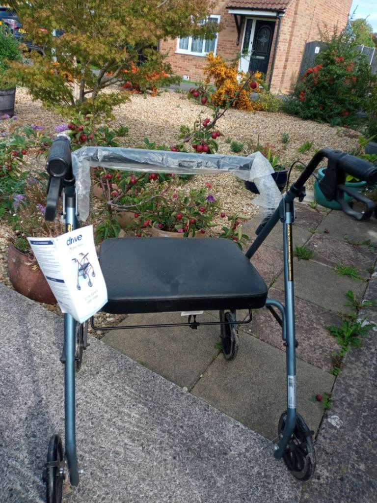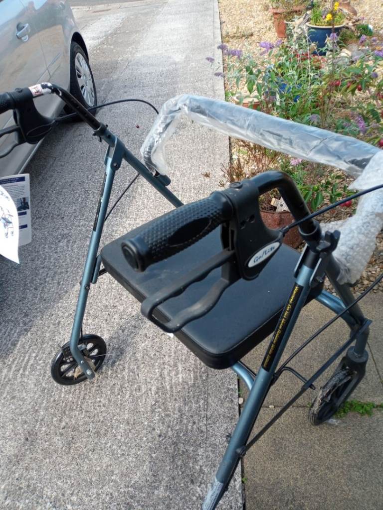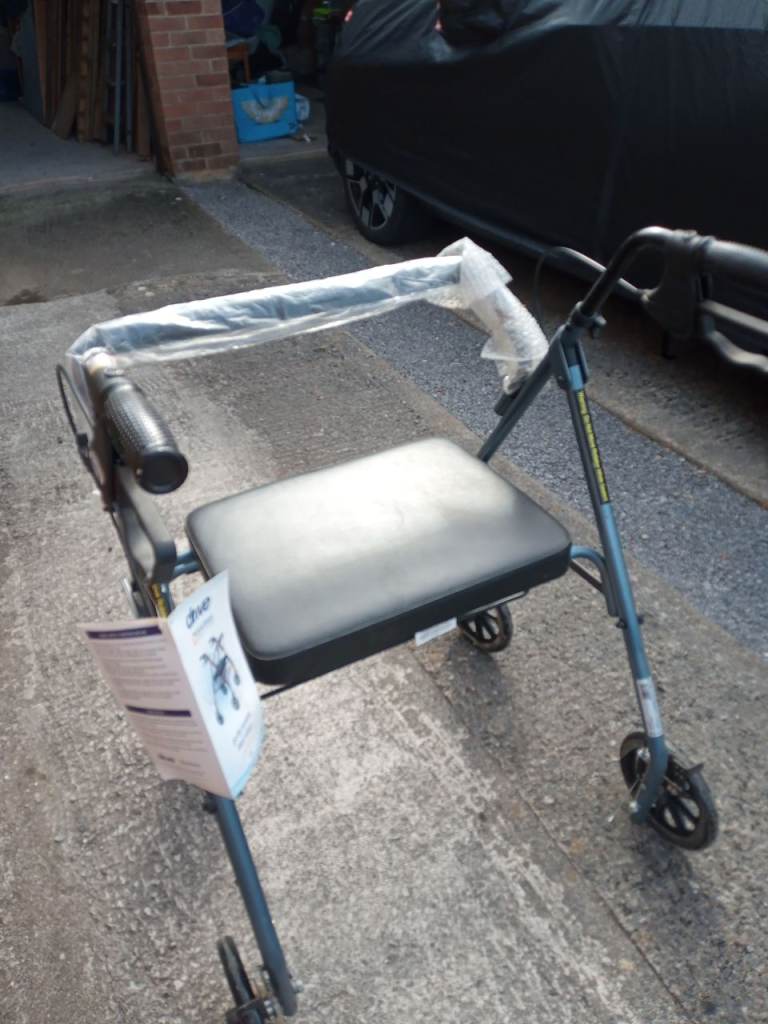 New Rollator/walker. 4 wheels. Strong and sturdy. Will fold and fit car boot. Suit larger person. It was bought for me when I came out of hospital but too big, I now have a smaller 3 wheel modern.