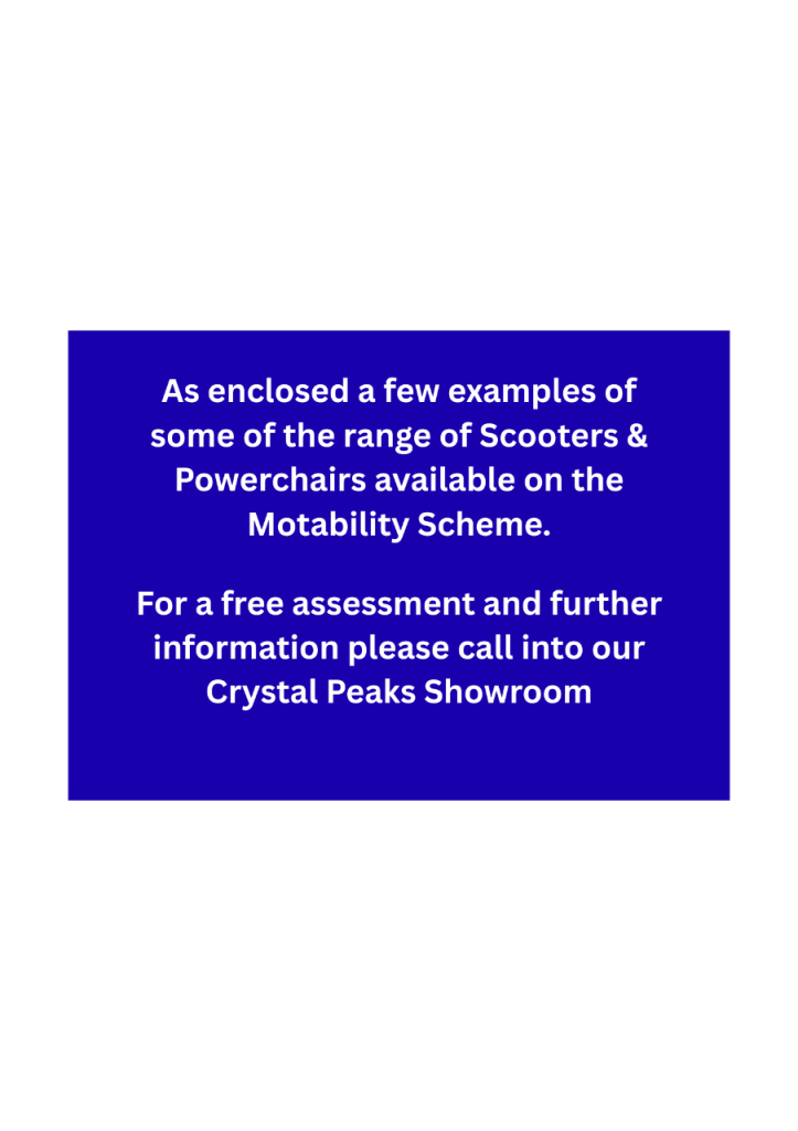 We come to your area for stairlift home assessments and scooter or powerchair demos including Motability customers. Visit our Crystal Peaks showroom or call and ask for Tanith or Sharron. Quote “Crystal Peaks Advert.”