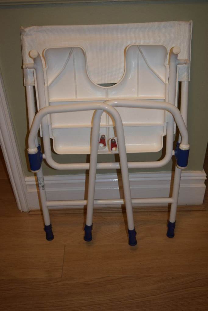 Freestanding shower/wetroom chair made by Aquatec. Folding for when not in use. Adjustable legs to suit height of occupant.