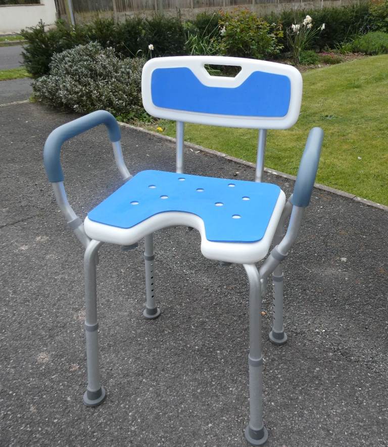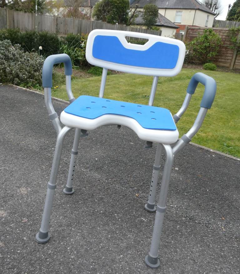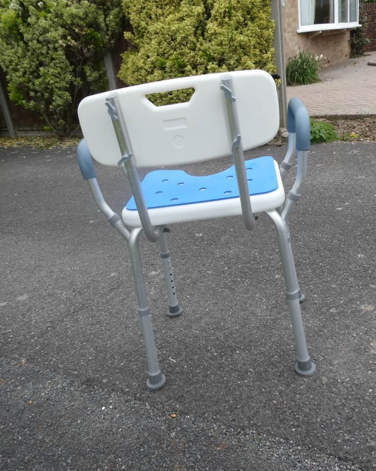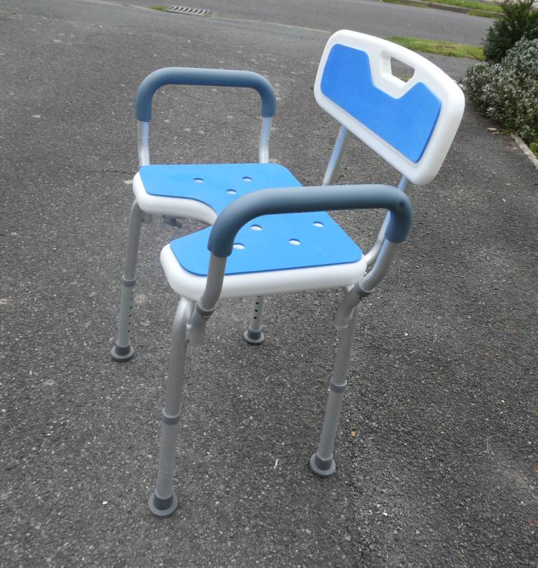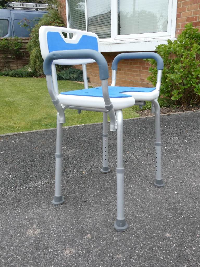 Light weight stool for sitting on in the shower. Adjustable legs to change height of seat. Soft rubber on seat pad.