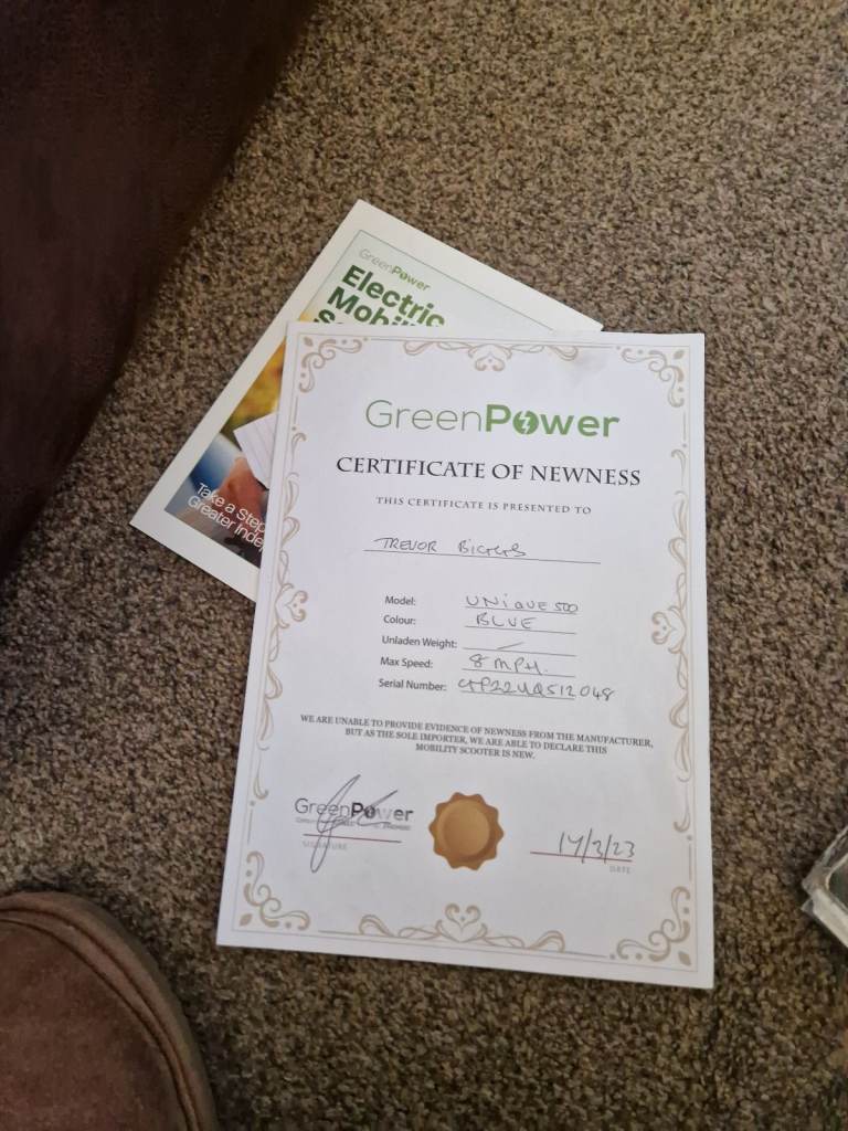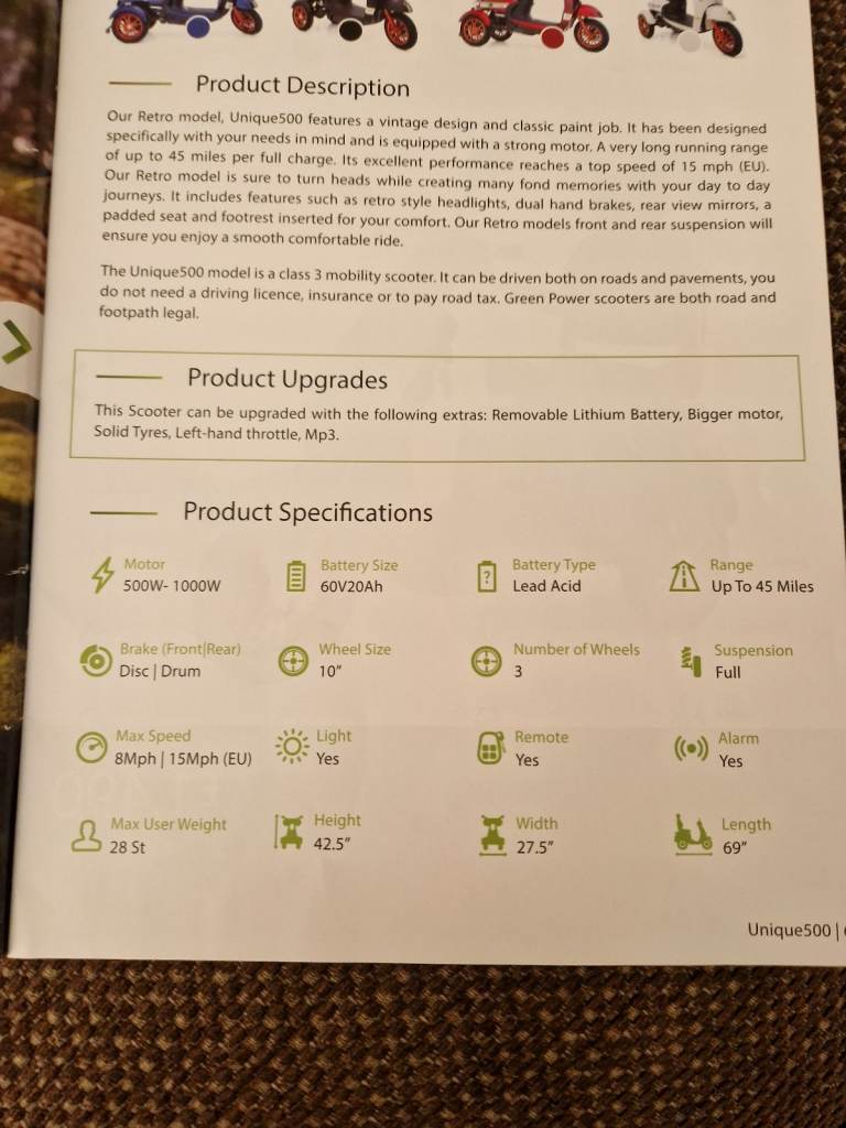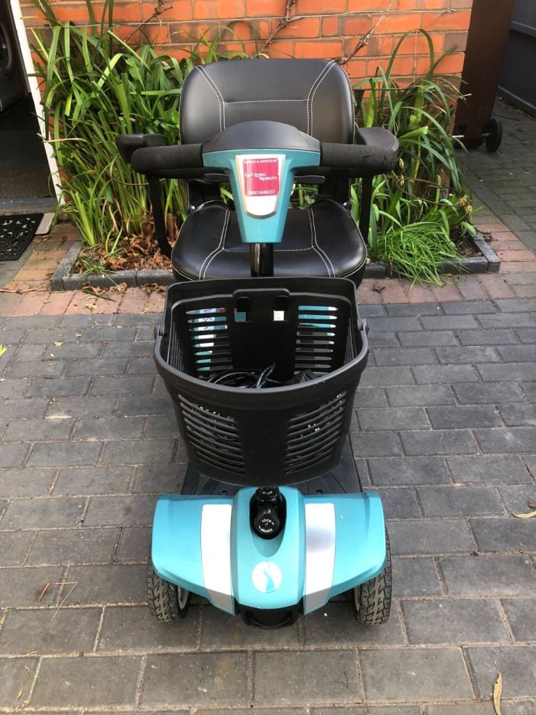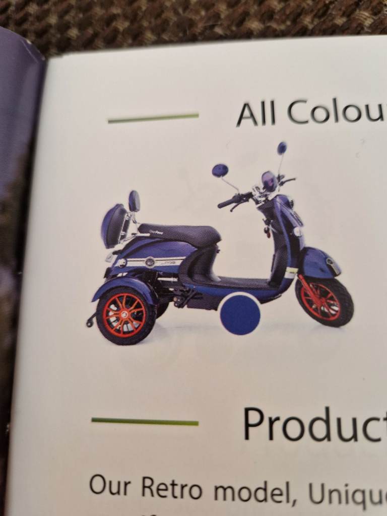 8mph blue 3wheel scooter, just like the old vespa. Bought for £1549. It has not been used. Still in mint condition will accept £1000 ono. Solid tyres suspension extras. Disability got worse so I've never taken her out for a ride. Some of the extras I bought for it are saddle bags and small tool kit. It comes with a full cover although it's been under a sheet in my shed. Well worth the money and far better than some of these tiny wheeled scooters you see. Come look at it make me an offer. Please no time wasters.